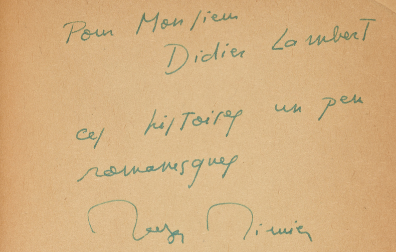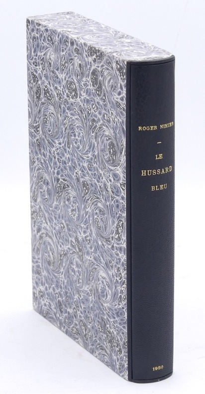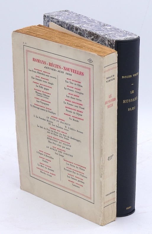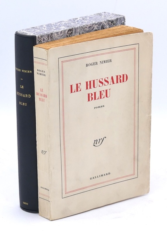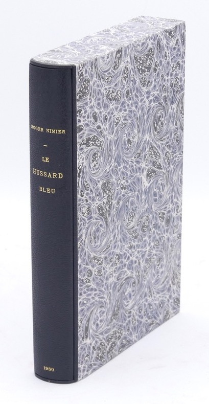 Édition originale du chef d’œuvre de Nimier. Cette chronique intime, à la fois cynique et tendre, d’un peloton de hussards qui pénètrent en Allemagne en 1945 rendit Roger Nimier célèbre à 25 ans. Elle rassembla sous son nom, à la suite d’un article de Bernard Frank dans la revue "Les Temps modernes", la génération littéraire des «Hussards»: Antoine Blondin, Michel Déon, Jacques Laurent et Roger Nimier. Se plaçant sous le patronage de leurs aînés Jacques Chardonne et Paul Morand, ces écrivains se sont distingués par un anticonformisme insolent dans la manière et dans le style et une opposition à l’existentialisme de Sartre. Céline, qui n’était pas réputé pour sa bienveillance en matière de critique, jugea le Hussard bleu épatant: «je me marre dès la première page et, à la vingtième j’arrête plus! Voilà un roman comme j’aime – en direct et savant quand même, oh! subtil habile roublard… sensible – oh! là là je désopile!» (lettre à l’auteur, 15 octobre 1950). Exemplaire du service de presse enrichi d’un envoi autographe à Didier Lambert: «Pour Monsieur Didier Lambert, ces histoires un peu romanesques, Roger Nimier». Ancien résistant du réseau Combat, Didier Lambert (1910-1962) avait fondé après-guerre l’hebdomadaire économique et financier "La Vie française" qui perdura jusqu’en 1999 sous ce titre et jusqu’en 2008 sous le titre "La Vie financière". Bon exemplaire conservé dans un bel emboîtage en forme de reliure.
