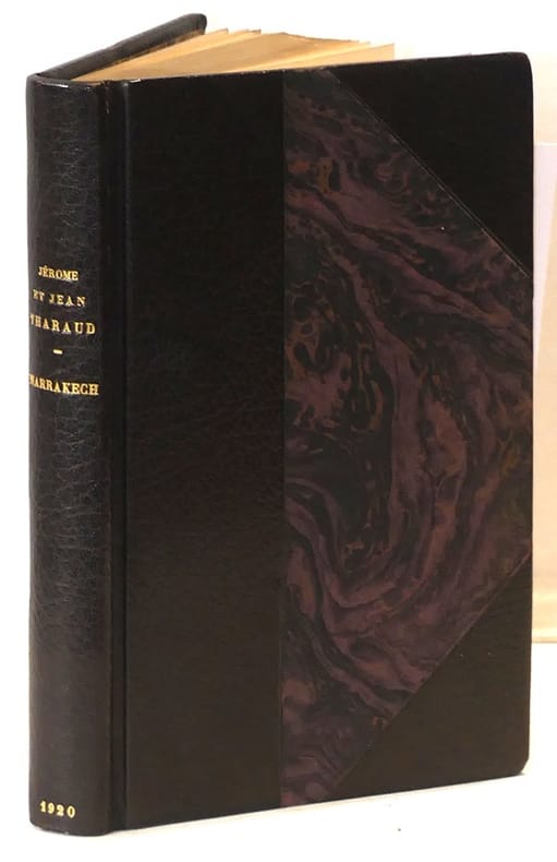 Édition originale, un des 30 sur Japon impérial (n°52) venant juste après 30 exemplaires sur Chine. L’oeuvre de Jérôme et Jean Tharaud est sans doute l’un des plus beaux exemples d’écriture à quatre mains: pendant plus de cinquante ans, ils composèrent ensemble romans pittoresques, peintures de mœurs orientales, récits de guerre et reportages, le cadet étant chargé du premier jet et l’aîné de la mise au point. Les deux frères, adoubés par Charles Péguy qui leur prêta les noms de Jean l’apôtre et de Jérôme, le Père de l’Église, semblent n’avoir été séparés que par la mort – et encore, d’une année à peine. Ils reçurent ensemble le prix Goncourt pour Dingley, l’illustre écrivain (1906) puis le Grand prix de littérature de l’Académie française (1919), avant de prendre place parmi les quarante à quelques années d’intervalle. Marrakech ou les seigneurs de l’Atlas appartient à la série marocaine, qui comprend aussi Rabat ou les Heures marocaines (1918) et Fès ou le Bourgeois de l’Islam (1930). C’est l’une des plus réussies parmi les oeuvres inspirées de leurs nombreux voyages Bel exemplaire agréablement établi par Charles Septier. «Jérôme Tharaud» et «Jean Thauraud», Académie française [en ligne]. Fléty, 161.