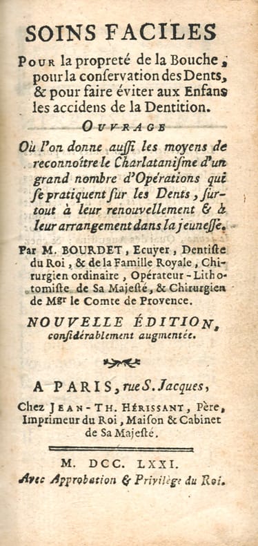 Deuxième édition, augmentée, de cet ouvrage populaire du dentiste royal Bourdet. Publié pour la première fois en 1759, il s’agit d’un condensé de son grand ouvrage Recherches et observations sur toutes les parties de l’art du dentiste (1757). Bourdet avait souhaité donner un ouvrage portatif, facile de consultation, afin de «réveiller les hommes sur un de leurs plus précieux avantages, qui est le plus négligé de tous». L’ouvrage est divisé en dix parties abordant successivement les Causes qui gâtent les dents et des moyens de les prévenir, les Précautions à prendre pour empêcher que les dents ne se gâtent, les Maladies et autres causes qui altèrent la blancheur des dents, les Maladies des gencives et les alvéoles, les Soins que l’on peut apporter soi-même aux dents gâtées, des Remarques sur la douleur des dents, les Soins journaliers qu’il est nécessaire de donner soi-même à ses dents, etc. Parmi les nombreux bons conseils du dentiste, on relève d’amusantes remarques, comme celle-ci: «il est encore très-nuisible aux personnes qui ont les Dents mauvaises, de trop se dégarnir la tête, & de s’exposer au serein, ainsi que de dormir la tête nue, ou trop peu couverte: de là proviennent bien des fluxions» (page 67). Membre du Collège de chirurgie, Étienne Bourdet (Birac-sur-Trec, 1722-Paris, 1789) fut à partir de 1760 dentiste des rois Louis XV puis Louis XVI. Ses Recherches et observations sur toutes les parties de l’art du dentiste publiées en 1757 lancèrent sa carrière et le consacrèrent comme l’un des meilleurs dentistes de son siècle. Il y poursuit les travaux de Pierre Fauchard, le père de la chirurgie dentaire, apportant de nombreuses améliorations aux techniques de son illustre prédécesseur. Guerini le décrit comme «un célèbre dentiste et un écrivain élégant, chez qui les dons de la culture littéraire et scientifique se sont conjugués avec une vaste expérience et un profond sens de l’observation». Bel exemplaire en maroquin rouge de l’époque, condition rare. Guerini, A History of Dentistry…, pp. 309-311.
