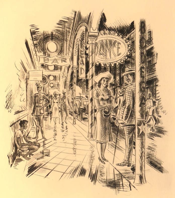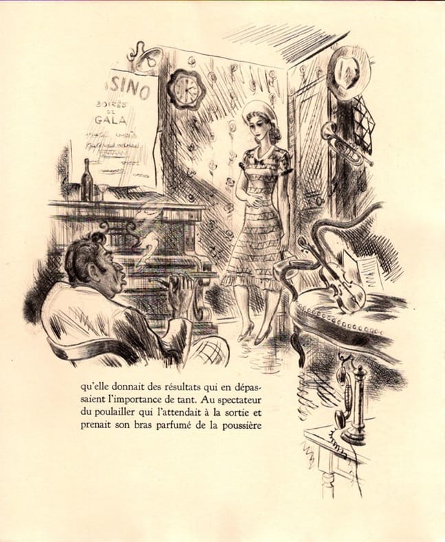 Une très belle réussite de Boullaire. Ce roman se situant dans les milieux de la prostitution et de l'espionage à Panama, fut publié la première fois en 1931. En 1934, il fut adapté à Paris en comédie musicale par Kurt Weill et, la même année, par les studios d'Hollywood. Cet ouvrage est illustré de 26 pointes sèches originales de Jacques Boullaire : 23 in-texte, 1 frontispice et 2 hors texte. Elles ont été tirées sur les presses de Georges Leblanc. Cet ouvrage a été imprimé à 200 exemplaires sur vélin de Rives pour les membres du Cercle Grolier. Celui-ci porte le n°27, imprimé pour M. Étienne Barrey. Jacques Boullaire (Paris 1893-Paris 1976), graveur, photographe et peintre officiel de la Marine (à partir de 1959) est incontestablement l'un des plus grands illustrateurs de la Polynésie. Élève de Guy Arnoux et de Démétrius Galanis, il commence par graver sur bois en 1926 puis au burin une dizaine d'années plus tard. Grâce à sa femme, il découvre en 1937 la Polynésie qui deviendra le sujet principal de son œuvre. Au cours d'un séjour entre 1949 et 1952, Boullaire dessine quatre mille croquis avec la certitude d'avoir réalisé la synthèse de la race maorie. On lui doit de célèbres ouvrages illustrés sur le sujet comme Le Mariage de Loti (1944), Victor Ségalen et l'Océanie (1944), Mon île Maupiti (1957)… Parfait exemplaire. Monod, Manuel de l'amateur de livres illustrés modernes, I, n°3726.
