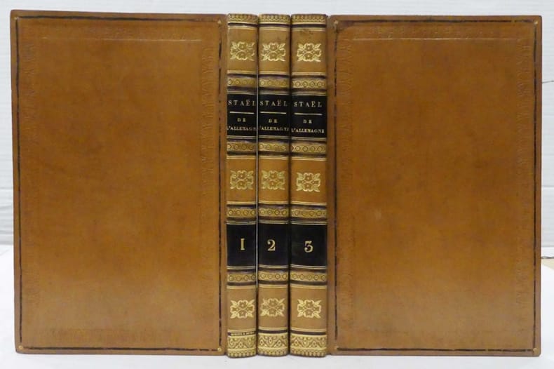 Seconde édition française de ce plaidoyer en faveur de la culture allemande. L’édition originale, datée de 1810, avait été censurée par Napoléon Ier qui n’avait pas goûté le Portrait d’Attila dans lequel il s’était évidemment reconnu. Les exemplaires furent donc entièrement mis au pilon ou brûlés et il ne subsiste de cette première édition que quelques jeux d’épreuves. La baronne de Staël fit alors paraître son étude à Londres, où elle était exilée, en octobre 1813: le succès fut immédiat, et on s’empressa de réimprimer De l’Allemagne après la chute de l’empereur. L’ouvrage est divisé est trois parties: De l’Allemagne et des mœurs des Allemands, La littérature et les arts et La philosophie et la morale. "En faisant l’éloge de l’ailleurs, Mme de Staël dénonce avec vigueur l’épuisement et la stérilité des lettres françaises et fait l’apologie de l’enthousiasme sous toutes ses formes. Parce qu’elle prône la puissance du sentiment et donne congé à l’esthétique classique, elle livre un ouvrage résolument romantique" (Simone Balayé). C’est à la suite de cette publication que la vallée du Rhin devint un passage obligé pour les écrivains romantiques, depuis Chateaubriand jusqu’à Victor Hugo en passant par Alexandre Dumas et Gérard de Nerval. Séduisante reliure de Simier, le relieur du roi. René Simier (1772-1843), dit Simier père, originaire du Mans, fut d’abord le relieur de l’Impératrice Marie-Louise, puis"relieur du roi" sous la Restauration et ensuite sous Louis-Philippe. Il s’établit à Paris dès la fin du XVIIIe siècle. Il eut un impact considérable sur l’art de la reliure, techniquement et esthétiquement, en assurant la transition entre le Néo-classicisme et le Romantisme. Son matériel de dorure a été vendu aux enchères en juin 2010. Très bel exemplaire en reliure de l’époque signée. Escoffier, Le Mouvement romantique 1788-1850, n°234, p. 64. Quérard, La France littéraire, IX, pp. 251-252. Vicaire, Manuel de l’amateur de livres du XIXe siècle, VII, col. 653. De l’Allemagne, éd. de Simone Balayé, Garnier-Flammarion, 1968. Fléty, Dictionnaire des relieurs français, p. 152.