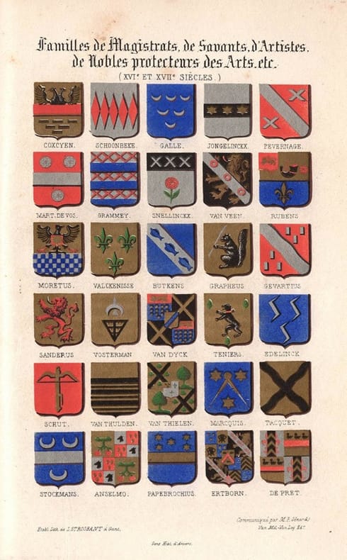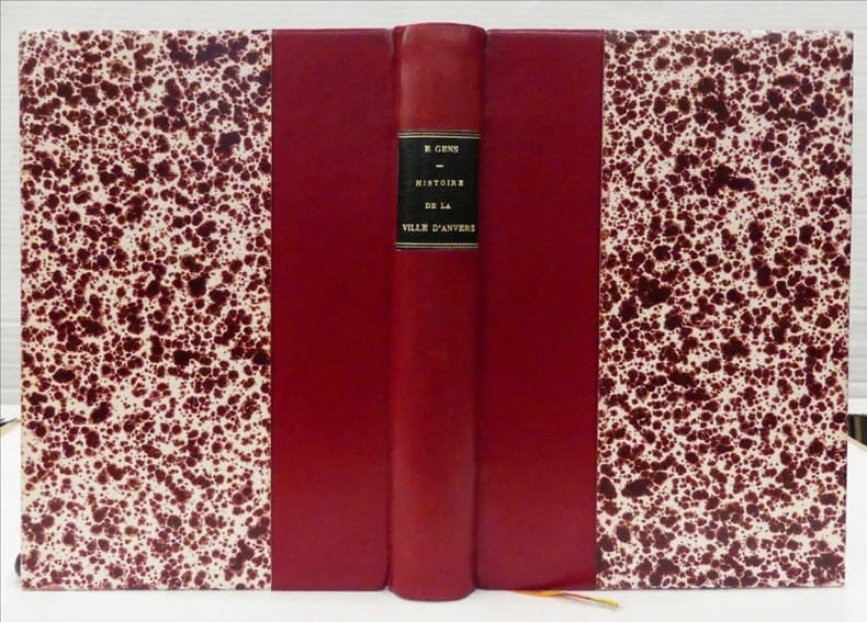 Edition originale. Cet ouvrage conte l’histoire de la ville d’Anvers, de sa fondation au VIIe siècle jusqu’à l’annexion de la ville aux Pays-Bas espagnols au XVIe siècle. L’ouvrage est richement illustré d’un frontispice en chromolithographie figurant les armoiries de la ville, de 23 planches et de nombreuses vignettes figuratives gravées dans le texte. Les planches se composent de 4 chromolithographies figurant les armoiries des familles et corporations d’Anvers, deux planches dépliantes donnant un panorama d’Anvers au début du XVIe siècle, de plusieurs vues de la ville d’Anvers à différentes époques et de portraits d’illustres personnalités de la ville. Eugène Gens fut professeur d’histoire à l’école de l’Athénée à Anvers. Il rédigea plusieurs ouvrages sur l’histoire de la Belgique et des Flandres. De la bibliothèque de Charles Herpin. Il fut directeur général de la Société générale de 1867 à 1872. Son ex-libris décoré fut conservé et soigneusement recollé après la reliure. Très bon exemplaire.
