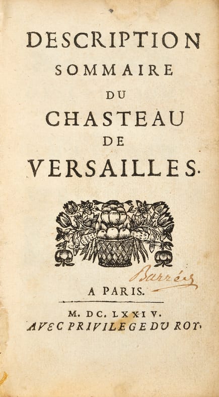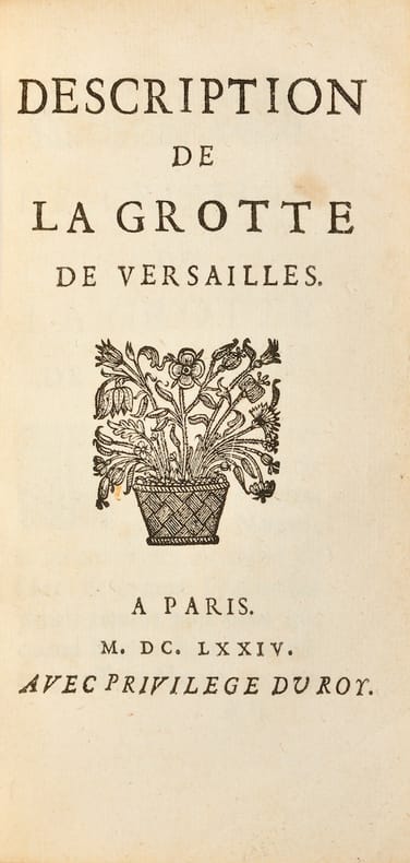 Réunion de trois rares ouvrages de Félibien sur Versailles au temps de Louis XIV. La Description sommaire du chasteau de Versailles et Les Divertissemens de Versailles sont en édition originale. La Description de la grotte de Versailles avait paru pour la première fois en 1672. Marqué dès son plus jeune âge par l’épisode de la Fronde, Louis XIV entreprit en 1661 la transformation du pavillon de chasse de Versailles en demeure royale. À partir de cette date et jusqu’à la fin de sa vie, le château et son domaine vont connaître d’importants travaux : avant-cour en 1662, enveloppe de Le Vau en 1668-1670, pavillons des Secrétaires d’État en 1670-1671… Le roi quittera définitivement le Palais du Louvre en mai 1682 pour s’installer avec la Cour à Versailles, devenu le symbole de son pouvoir absolu. Les trois ouvrages d’André Félibien (Chartres, 1619-Paris, 1695), historiographe du roi et premier secrétaire de l’Académie royale d’architecture, rendent compte des premières transformations du château. Ils sont d’autant plus intéressants que bon nombre d’éléments qu’ils décrivent furent supprimés ou modifiés lors des réaménagements successifs. «La Description sommaire du chasteau de Versailles, publiée par Félibien, précisément en cette même année 1674, vient à l’appui du plan de Silvestre, confirmant ou complétant ses renseignements, fournissant sur la distribution des appartements, sur la décoration des fontaines, des détails qu’un plan ne saurait indiquer. Le plan et la description de 1674 méritaient une attention particulière; nous n'avons pas de témoignage contemporain plus complet sur les grands travaux de la première partie du règne de Louis XIV» (Jules Guiffrey). Édifiée en 1666, la «grotte de Thétys» était un des éléments majeurs du jardin de Versailles. Elle comprenait trois importants groupes sculptés en marbre représentant Apollon baigné par les nymphes et les chevaux du char du Soleil, qui furent déplacés pour créer le Bosquet des Bains d’Apollon lors de la construction de l’aile nord du Château en 1684. Le dernier opuscule, les Divertissemens de Versailles, décrit les six journées de fêtes somptueuses qui eurent lieu entre le 4 juillet et le 31 août 1674 pour célébrer la reconquête de la Franche-Comté. Ex-libris manuscrit au nom de Jacques ou Jean Barre sur le dernier feuillet et le titre. Bon exemplaire en reliure de l’époque. Jules Guiffrey, Comptes des bâtiments du Roi sous le règne de Louis XIV, I, 1881, p. XLIV.