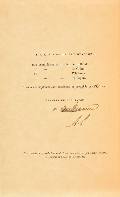 Édition originale. Exemplaire sur Japon, premier papier dont il a été tiré 10 exemplaires numérotés mis dans le commerce et paraphés par l'auteur. Celui-ci ne porte pas de chiffre à la numérotation mais la mention manuscrite “de Jeanne”. L’exemplaire de Jeanne Daudet. Il s'agit de l'exemplaire de Jeanne Daudet, petite fille de Victor Hugo, belle-fille d'Alphonse Daudet. Elle avait épousé son fils Léon.
