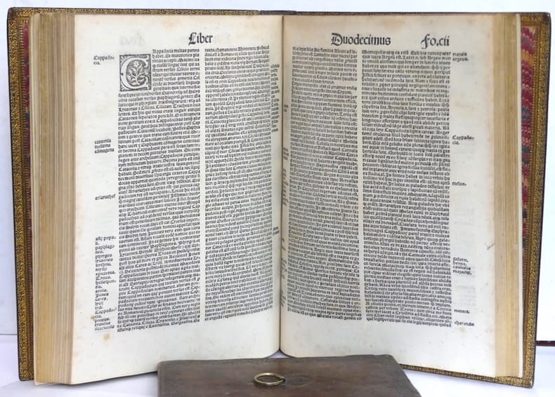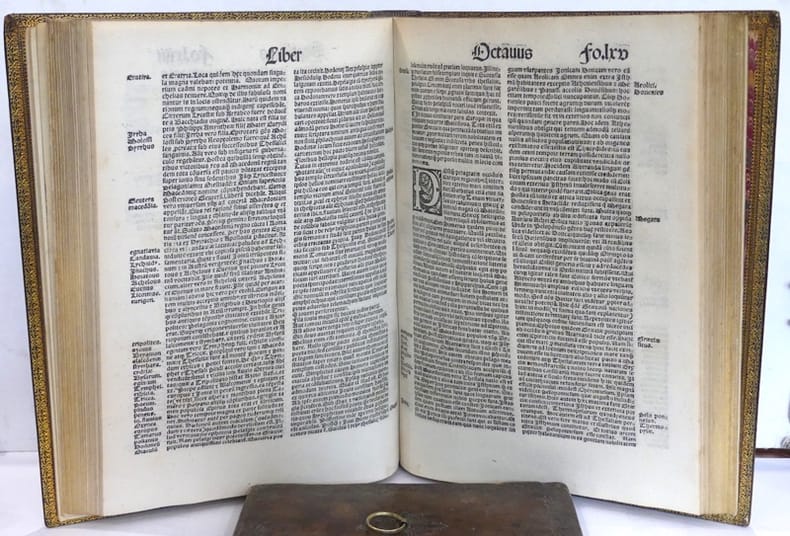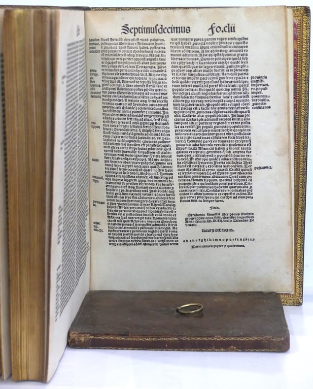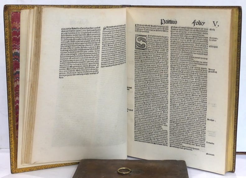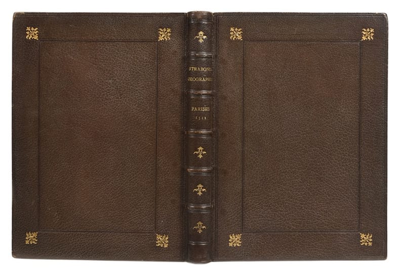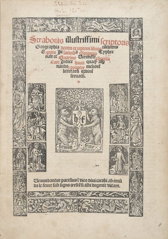 Rare première édition parisienne de cette bible de la géographie ancienne. Cette édition fut partagée entre quatre libraires, Claude Chevallon, Gilles de Gourmont, Hémon Le Fèvre et Olivier Senant. Elle est agrémentée d’un index et d’une épître dédicatoire de l’éditeur Théobald Pigenat à son maître Jérôme Aléandre, qui paraît pour la première fois. C’est un des premiers témoignages de la renommée acquise par l’érudit italien Jérôme Aléandre (1480-1542), invité à Paris en 1508 et nommé professeur de belles lettres puis recteur de l’université jusqu’en 1514. Le titre est orné d’un bel encadrement historié composé de plusieurs bois, provenant sans doute d’un livre d’heures ou d’une vie de Saints. Le texte est présenté sur deux colonnes, en caractères gothiques. Strabon, qui vécut vers l’an 60 de notre ère, rassembla vers la fin de sa vie des matériaux documentaires, ainsi que ses propres souvenirs de voyage à travers l’Orient (Syrie, Palestine, Égypte, Asie mineure) pour composer cette excellente description du monde connu, dont l’autorité fut incomparable tout au long du Moyen-âge. La reliure, non signée, est attribuée à Thompson par une note au crayon, ce qui est probable. Il s’agit certainement de l’exemplaire décrit dans L’Intermédiaire des bibliophiles de Durel en 1897, n°1074, à l’adresse de Le Fèvre et relié en maroquin La Vallière de Thompson. Installé à Paris au cours des années 1830, ce relieur exerça jusqu’en 1850 environ, avant que sa femme et son fils ne reprennent l’atelier. Ex-libris imprimé d’Henri Lambert au premier contreplat, avocat à Versailles. Très bel exemplaire en maroquin du XIXe siècle. Renouard, Inventaire chronologique des éditions parisiennes du XVIe siècle, II, n°459. Graesse, Trésor de livres rares et précieux, VI, 506. Ernest Jovy, François Tissard et Jérôme Aléandre, contribution à l’histoire des origines des études grecques en France, 2e fascicule, 1900, p. 97-100 (reproduit l’épître de Pigenat, datée par erreur de 1510).