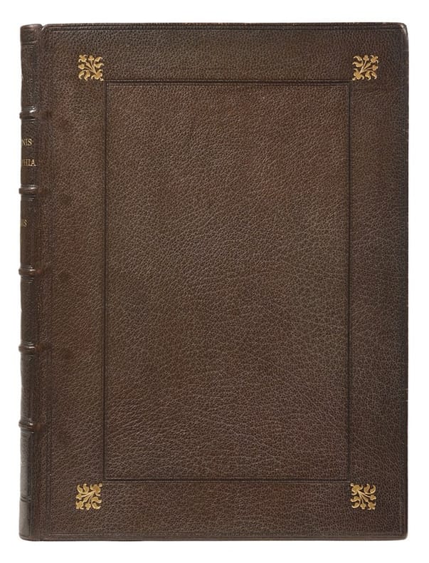 Paris, Le Fèvre, 1512. Petit in-folio (266 x 195 mm), 14 ff. n. ch., CLII ff. Maroquin brun, plats décorés de filets à froid à la Du Seuil avec fleurons d’angle dorés, dos à nerfs orné de même, auteur, titre, date et lieu dorés, double filet doré sur les coupes, dentelle intérieure, tranches dorées, coiffes et coins légèrement frottés, cahier b placé entre les cahiers e et f (reliure du XIXe siècle).