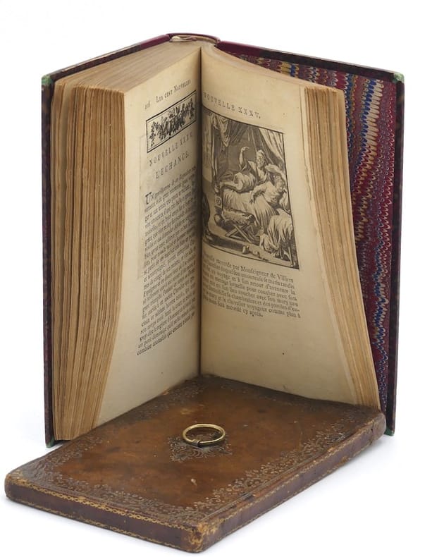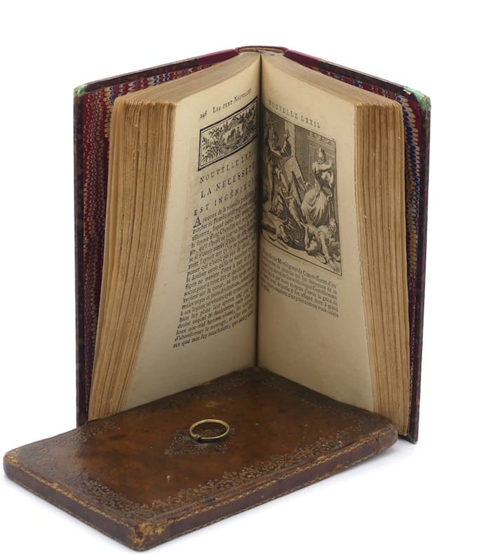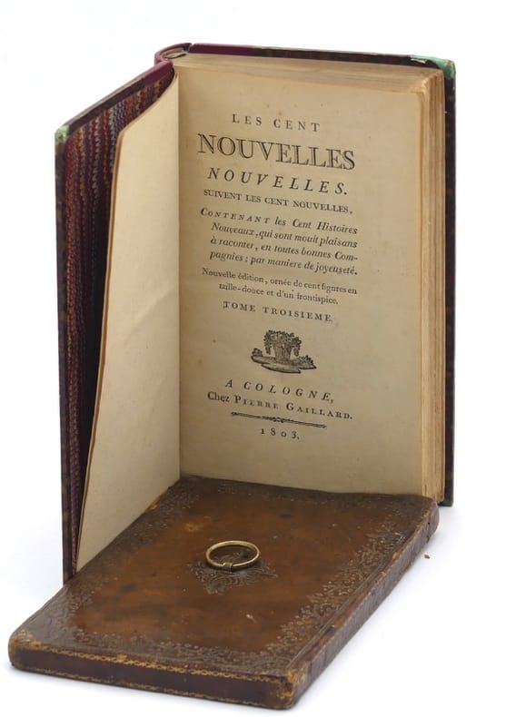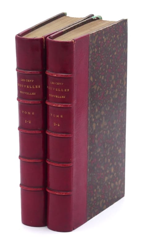 Cette édition est illustrée d'un frontispice et de 100 gravures à mi-page d’après les dessins de Romain de Hooghe. Les Cent Nouvelles nouvelles sont considérées comme le premier recueil de nouvelles français. Cette édition est la réimpression d’une des meilleures éditions illustrées de ce recueil. Destinées à la cour de Bourgogne, rédigées dans le style du Decameron de Boccace, les Cent Nouvelles nouvelles sont contées par divers seigneurs de cette cour où Philippe le Bon, amateur de lettres et des arts, attirait à lui littérateurs, poètes, peintres et musiciens. Les bibliographes ont longtemps attribué à Antoine de La Sale, le secrétaire de ce petit cercle de lettrés, la paternité de la majorité des nouvelles du recueil, désormais attribuées à Philippe Pot. De la bibliothèque de P. R. Dupperay avec son ex-libris gravé (1945) comprenant la devise "Sanctus Amor Patriae Dat Animum". Très bon exemplaire. Brunet, I, 1735-1736 (pour l’édition de 1701).
