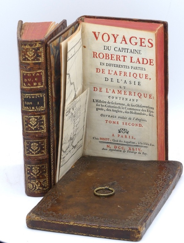 Édition originale.Cette relation prétendument traduite de l'anglais d'après le journal d'un certain Robert Lade est en réalité une supercherie, une relation de voyage imaginaire composée par l'abbé Prévost.Celui-ci, deux ans avant la publication de sa grande Histoire des voyages, se servit des matériaux de véritables relations pour imaginer ces aventures de commerçants anglais parcourant les côtes de l'Afrique avant de se rendre aux Antilles en passant par les îles Canaries, puis de remonter la côte Est de l'Amérique vers le Nord. L'ouvrage est illustré de deux belles cartes dépliantes. La première, gravée par Lattré en 1743, représente une carte marine s'étendant de la côte Est des États-Unis à l'île de Java, avec le continent africain au centre. La seconde, gravée par Desbruslins d'après Bellin, représente en détail les îles des Antilles, le Golfe du Mexique et la côte Est des États-Unis jusqu'à la baie d'Hudson au Nord.En puisant sa documentation dans des récits de première main, Prévost rendit si vraisemblable sa relation de voyage que celle-ci fut prise pour réelle des années durant.Bel exemplaire en veau marbré de l'époque.Leclerc, Bibliotheca americana, 1878, n° 315. Sabin, A Dictionnary of books relating to America, I, n° 38530. Boucher de la Richarderie, Bibliothèque universelle des voyages, I, p. 268. Bibliothèque de feu M. Ch. Chadenat, II, n° 5080. Quérard, La France littéraire, IV, p. 383. Ducarré, Une supercherie littéraire de l'abbé Prévost. Les voyages de Robert Lade, in Revue de Littérature Comparée, XVI, p. 465.