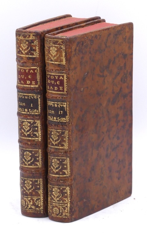 Paris, Didot, 1744. 8vo. Two volumes uniformly bound in two very nice Cambridge mirror-style full calf bindings with five raised bands, richly gilt spines, blindstamped ornamentation to board, single gilt line to boarders of boards and edges of boards gilt. Front boards with royal gilt super ex-libris. A small paperlabel pasted on to upper compartment on each binding. A very nice set. (1 blank), (1), XVI, 370 pp. (1 blank), (1) 360 pp. + 2 folded maps.