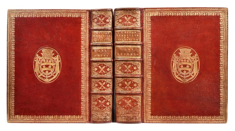 Édition originale. Cet important travail d’érudition sur la langue hébraïque, présentant sur deux colonnes les termes hébreux et judéo-araméens de la Bible, est l’œuvre des bénédictins de la congrégation de Saint-Maur. Commencé par Pierre Guarin (Tronquay, 1678-Saint-Germain-des-Prés, 1729), bibliothécaire de Saint-Germain-des-Prés et l’un des meilleurs orientalistes de son temps, l’ouvrage fut terminé quinze ans après sa mort par son élève Nicolas Letournois (Le Havre, 1677-Saint-Denis, 1741), lui aussi mort avant l’impression de ce monument linguistique. Précieux exemplaire tiré en grand papier et relié pour le chancelier d’Aguesseau. Élève de Jean Domat, Henri-François d’Aguesseau (Limoges, 1668-Paris, 1751), jurisconsulte émérite, eut une brillante carrière au service du roi: reçu avocat au Châtelet en 1690, avocat-général au Parlement et procureur général en 1700, il fut nommé à la dignité de chancelier de France en 1717. Disgracié et exilé en 1718 pour s’être opposé au système de Law, il fut à nouveau chancelier entre 1720 et 1722 puis de 1737 à 1750. Voltaire, qui pourtant ne l’aimait guère, voyait en lui “le plus savant magistrat que jamais la France ait eu”. Il a laissé des ouvrages d’érudition, d’histoire et de philosophie. Sa bibliothèque était l’une des plus remarquables de son temps, riche de 20 000 ouvrages et ouverte à tous les domaines. Les deux volumes ont ensuite appartenu à Alexis-Ferréol Perrin de Sanson, dont la bibliothèque, composée partiellement de celle de d’Aguesseau et de l’abbé Rive, a été vendue en 1836 (cat., 1836, n°205). Son ex-libris gravé, partiellement arraché, figure au premier contreplat. Longue note à l’encre sur la première garde, relative à l’auteur; cachet de la bibliothèque de l’École Sainte-Geneviève sur les titres. Splendide exemplaire en maroquin à dentelle et aux armes. Brunet, Manuel du libraire et de l’amateur de livres, II, col. 1774. Graesse, Trésor de livres rares et précieux, III, p. 166.