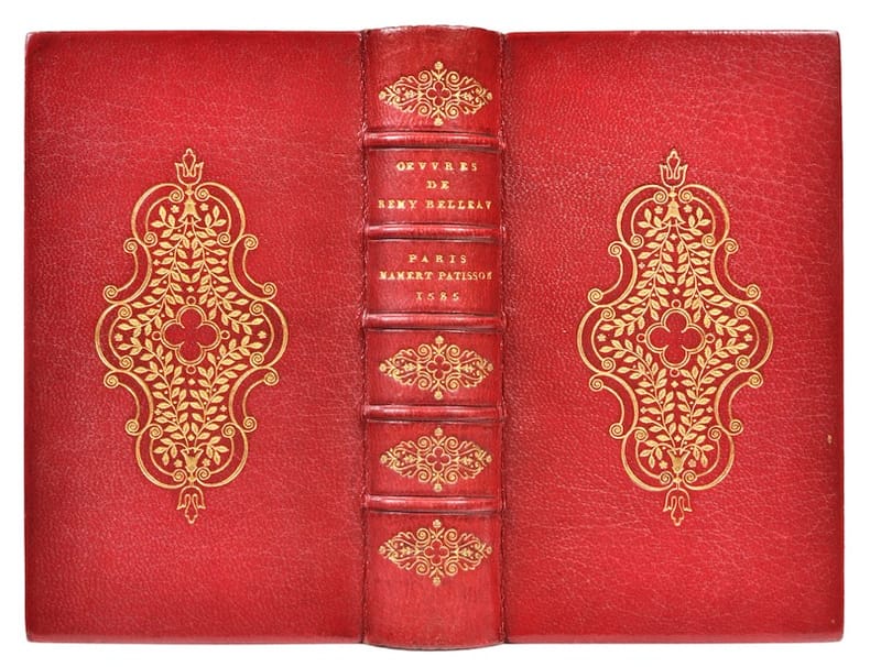 Paris, Mamert Patisson, 1585. In-12 (142 x 83 mm), 304 ff. ch., 2 ff. n. ch., 2 ff. blancs, 154 ff. n. ch., 8 ff. n. ch. Maroquin rouge, composition florale en médaillon sur les plats, dos à nerfs orné, titre, auteur, lieu, éditeur et date dorés, double filet doré sur les coupes, dentelle sur les chasses, tranches dorées sur marbrure (Trautz-Bauzonnet).
