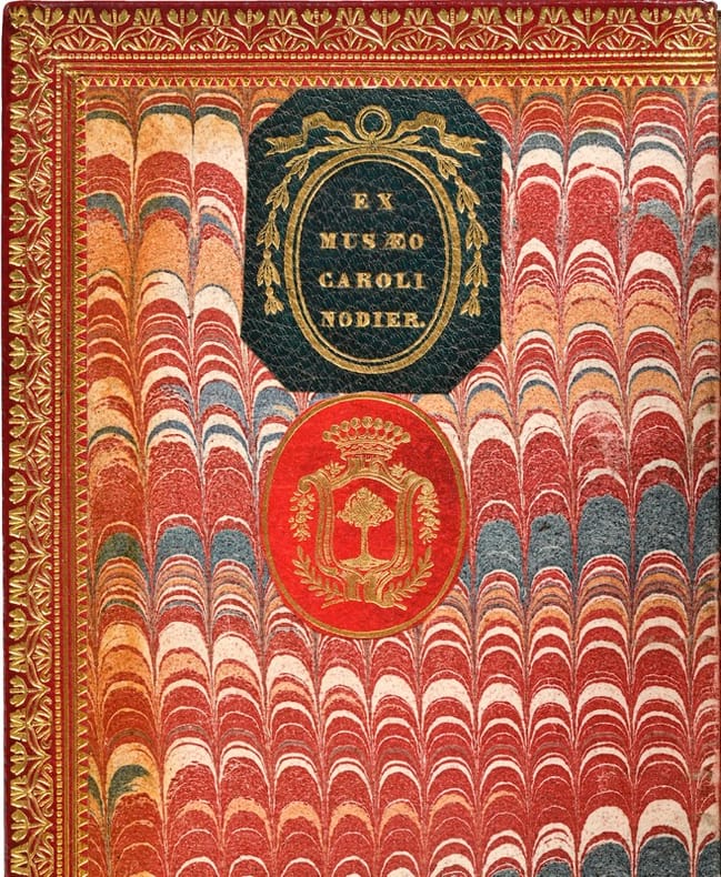 Précieuse seconde édition augmentée. Remarquablement imprimée en caractères italiques minuscules, elle est dédiée à Henri III qui avait nommé Mamert Patisson au titre si convoité d'Imprimeur royal. Entre autres, le premier tome comprend "Les Amours et nouveaux eschanges des pierres précieuses", les deux journées de "La Bergerie", les "Apparences d'Arat", le second contient la traduction d'Anacréon, des hymnes et des poésies, une comédie, "La Reconnue". On trouve en fin de volume, 6 feuillets contenant le "Tombeau de Remy Belleau" avec des pièces grecques, latines et françaises de Dorat, Jean Passerat, Ronsard, Baïf, Desportes et Jamyn. La mort de Rémy Belleau en 1577 fut l'occasion d'une des premières manifestations littéraires : Ronsard, Baïf, Desportes et Jamyn transportant, sur leurs épaules, la dépouille de leur ami jusqu'au couvent des Augustins. C'est à leur instigation que ses papiers furent rassemblés et que fut publiée la première édition collective en 1578. Exemplaire enrichi du portrait de Rémy Belleau gravé à l'eau-forte d'après celui gravé par Léonard Gaultier (Mayence, 1561-Paris, 1635). Il a été placé en regard de la première œuvre de l'ouvrage au feuillet 9. Exceptionnel exemplaire ayant appartenu à trois prestigieux bibliophiles : Charles Nodier (Besançon, 1780-Paris, 1844), le baron Léopold Double (Paris, 1812-Paris, 1881) et le comte de Fresne (Mons, Belgique, 1830-Paris, 1891). Acheté par le comte de Fresne en 1863 à la vente de la bibliothèque de Léopold Double, la notice du catalogue précise que "cet exemplaire est celui de Ch. Nodier, antérieurement relié en mar. vert par Thouvenin". Précieux exemplaire en maroquin de Trautz-Bauzonnet. Tchemerzine, I, 571. Catalogue de la bibliothèque de M. Léopold Double, n°122.