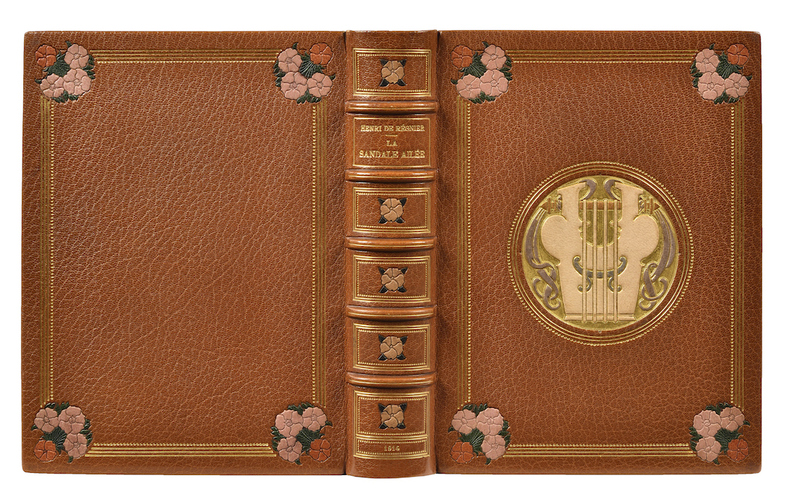 Paris, Société des Amis du Livre moderne, 1914 In-4 (249 x 187 mm), 4 ff. n. ch., 222 pp., 2 ff. n. ch. Maroquin fauve, filet au pointillé et triple filet dorés encadrant les plats, bouquet floral en écoinçon mosaïqué en maroquin rose, orange et vert, grand médaillon au centre du premier plat représentant une lyre mosaïquée en maroquin beige, gris, violet et marron sur fond doré, filets dorés d'encadrement, dos à nerfs orné d'une fleur mosaïquée en caisson, filet au pointillé et double filet dorés d'encadrement, auteur, titre et date dorés, double filet doré sur les coupes, chasses également mosaïquées, gardes de tabis de couleur parme, contreplats encadrés d'un large encadrement de maroquin fauve orné d'une fresque végétale dorée, tranches dorées, couvertures et dos conservés, étui bordé et doublé (Canape et Corriez).