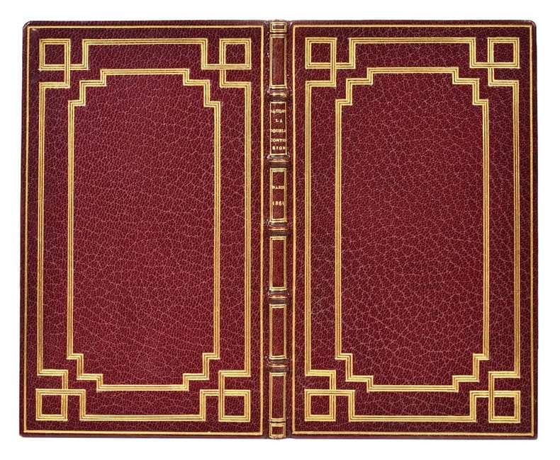 Paris, Poulet-Malassis & de Broise, 1861. In-16 (152 x 91 mm), 63 pp. Maroquin bordeaux, triple jeu d'encadrements dorés, dos à nerfs orné d'encadrements de double filet doré, filet simple sur les coupes, double jeu d'encadrement sur les chasses, gardes de tabis rouge, tranches dorées (M. Lortic).