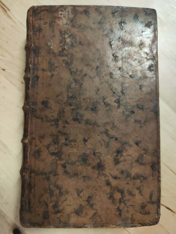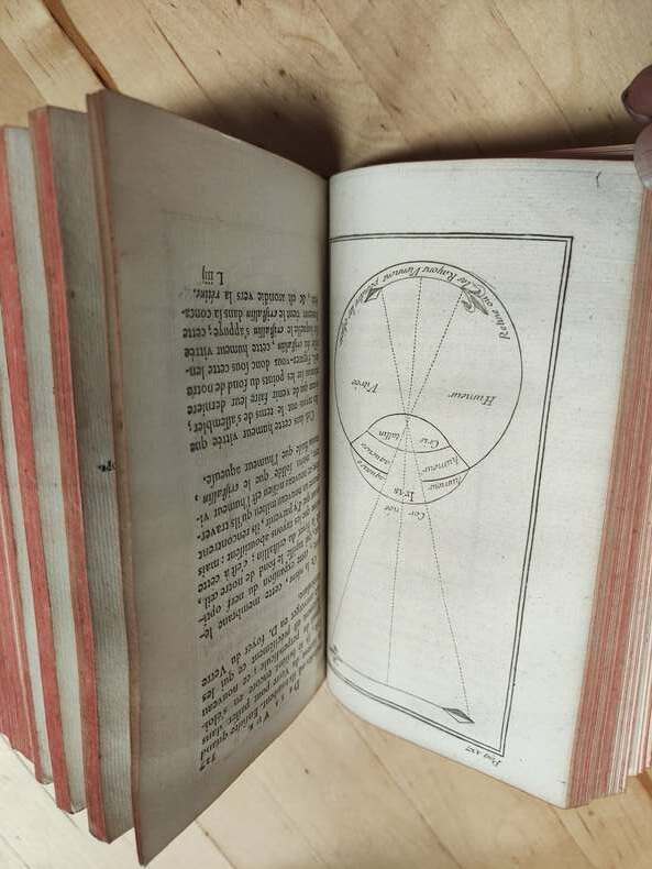 Londres 1744, in-12, fx-titre et titre-VIII-pages 5 à 12 ( A Madame la marquise du Chastellet)-4,71 pages (2). Portrait frontispice de Newton gravé-7 planches H.T., un tableau dépliant et figures dans le texte. Basane marbrée époque, dos orné, tranches rouges, petite usure des coins. Tampons Ex bibliotheca J.L. Aug. Mercklein Paris, sur la page de titre et au dessus du mot fin.(XXXIX)-(500gr)