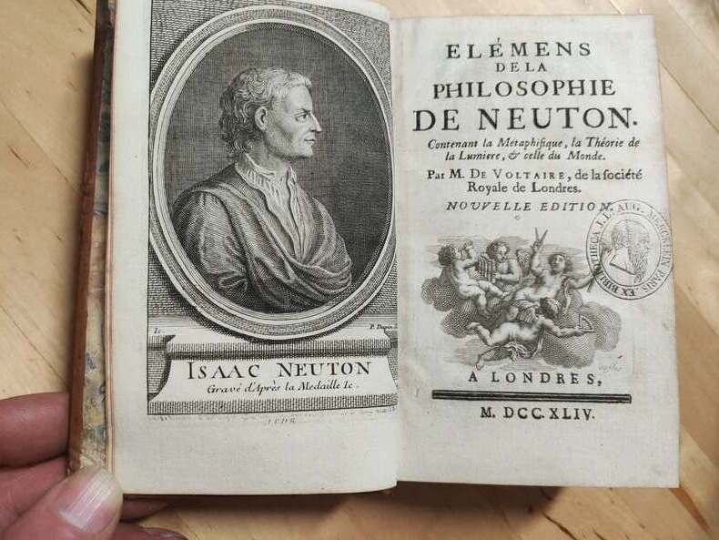 3ème édition de ce texte de Voltaire; contrefaçon publiée à Paris et non plus à Londres.Cet ouvrage, qui a contribué à populariser les théories et la pensée d’Isaac Newton, a été rédigé en collaboration avec sa compagne, Émilie du Châtelet, mathématicienne et physicienne, et traductrice des Principia Mathematica de Newton[3]. Rédigé en latin et en algèbre, l’ouvrage de Newton était très peu accessible. Voltaire ne serait jamais parvenu à le maitriser sans l’aide de sa compagne à l’égard de laquelle il reconnait volontiers sa dette : « Minerve dictait, et j’écrivais[4