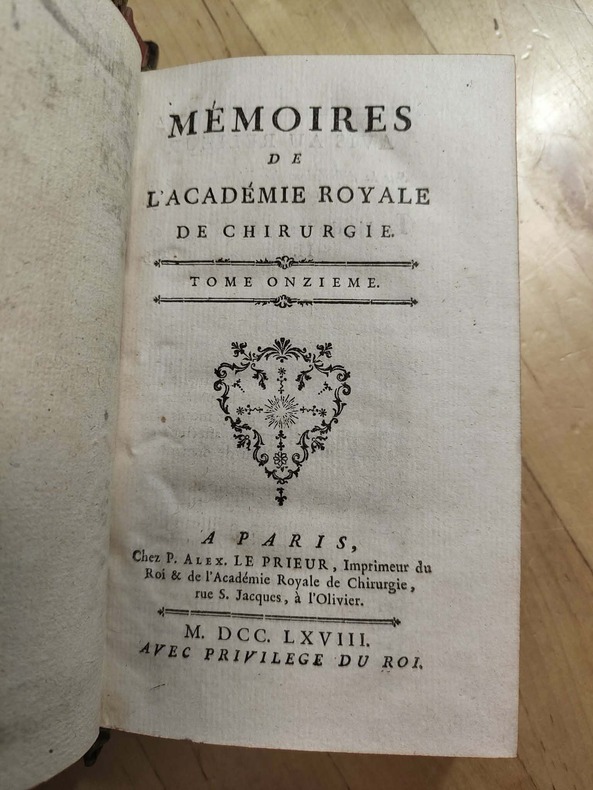 Tome 1V, - à Paris, chez Delaguette, Imprimeur de 'Académie Royale de Chirurgie, 1753, in 12, 334 p., beau frontispice ; Histoire de l'Académie Royae de Chirurgie, Eloges, de M. Marescha, de M. Petit, de M. Petit le Fils. Hernie de la Vessie, Apostèmes du foye, Epanchements dans le bas-ventre ; rel plein veau d'ep, épidermures, les pièces de titre et de tomaison manquent
