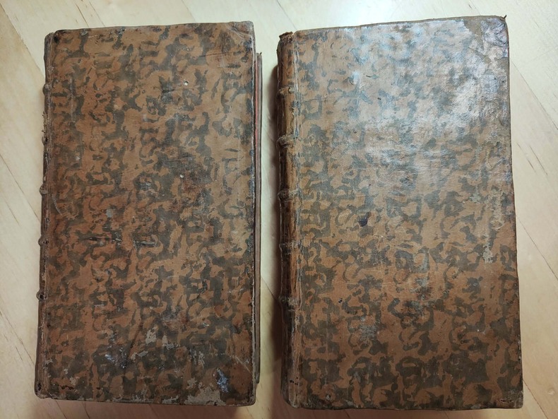 Amsterdam Aux dépens de la compagnie 1756, 4 parties en 2 volumes in-12 (8)-264+(1)246 pages. Basane marbrée époque, dos à nerfs orné, tranches rouges. Petits manques aux coiffes supérieures, petite usure des coins et coupes, petits frottements sur les plats. Ex libris manuscrit Labat. (XXXIX)-(850 gr.)