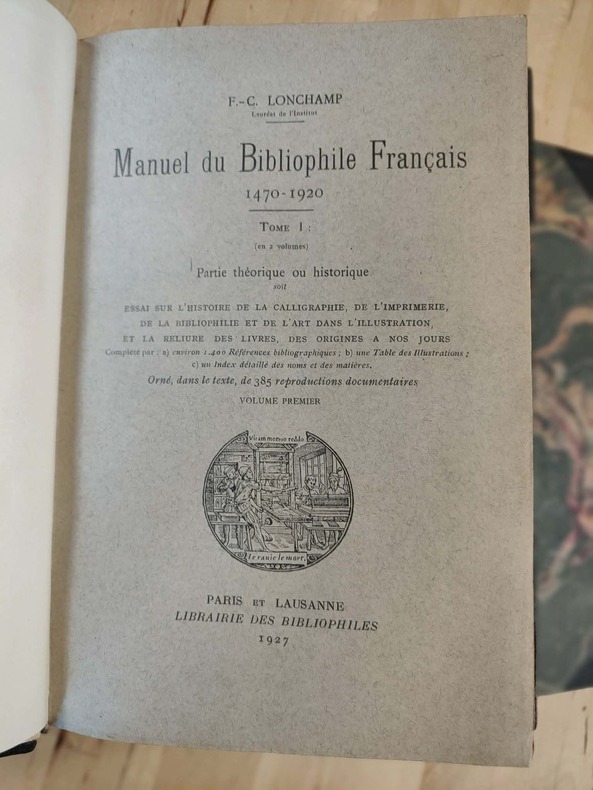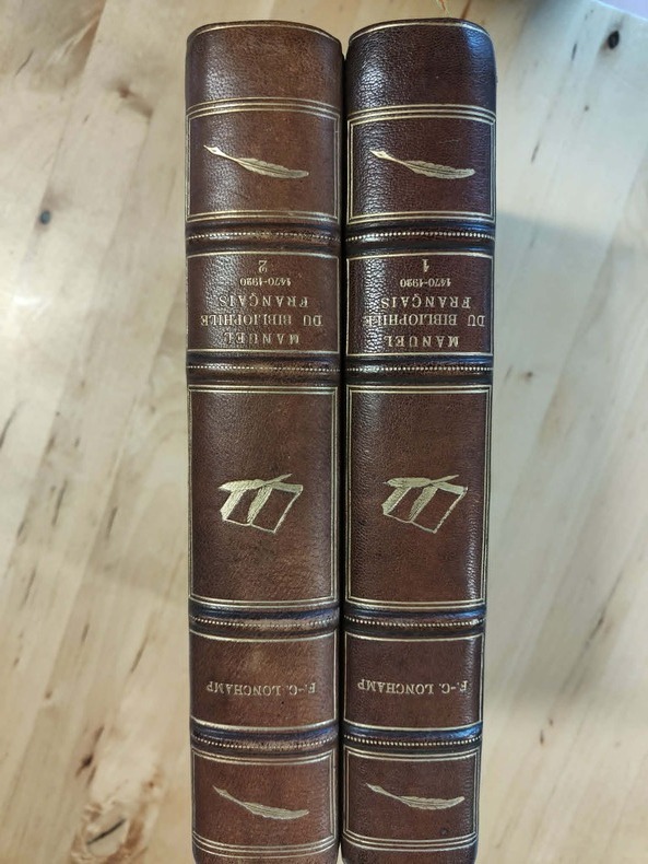 Ouvrage bibliographique classique de référence, recherché. Edition limitée à 1015 exemplaires: un des 1000 exemplaires sur vélin simili couché. Le premier tome (en 2 parties théorique et historique) consiste en un essai sur l'histoire de la calligraphie, de l'imprimerie, de la bibliophilie et de l'art dans l'illustration et la reliure des livres des origines à nos jours; le second tome (en 2 parties) est la bibliographie proprement dite.