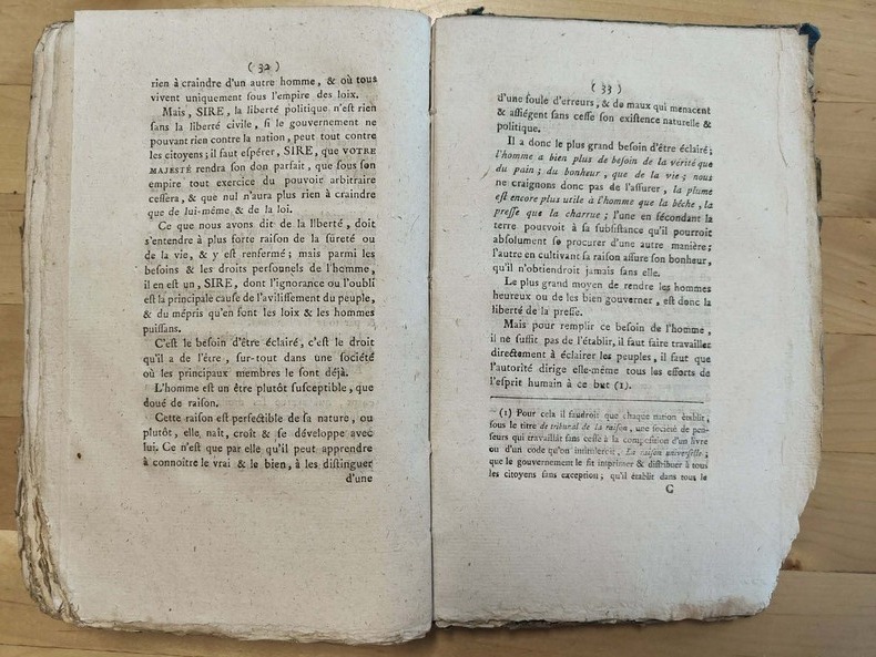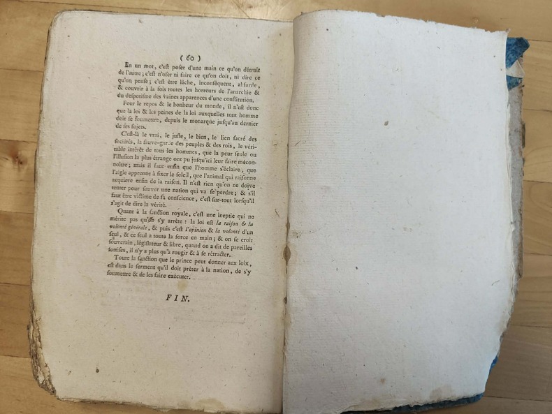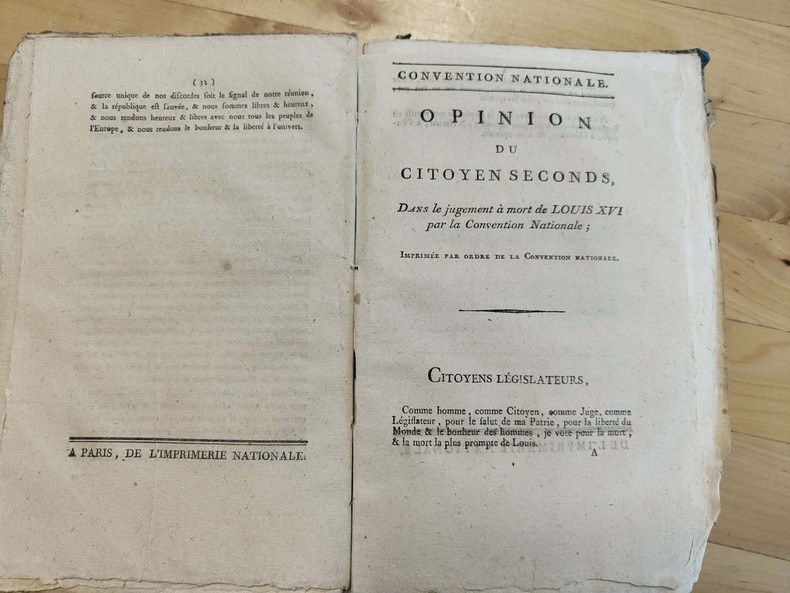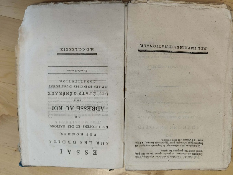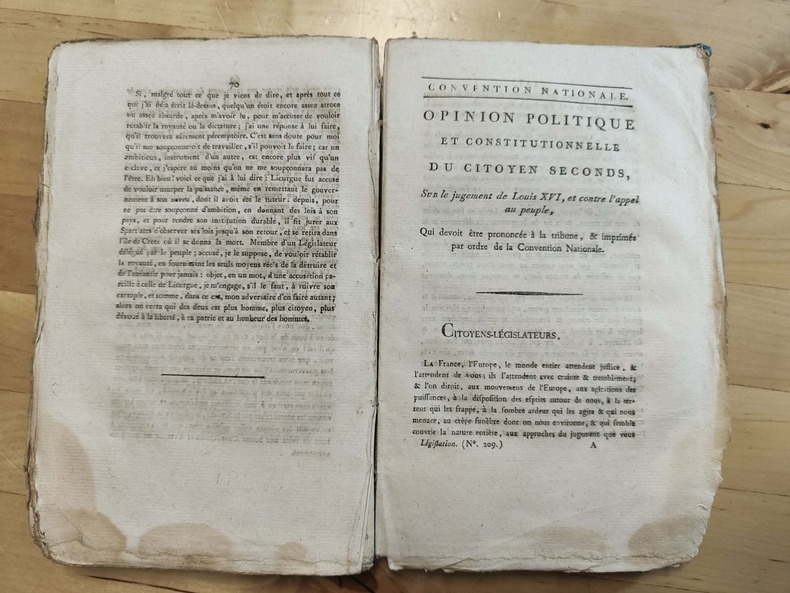 Paris de l'imprimerie nationale 1792-1793, in-8. Cartonnage papier époque, le dos est manquant, le papier des plats très abîmé ; les derniers feuillets sont rongés dans l'angle inférieur sans atteindre le texte, petite mouillure dans les marges inférieures. 1er cahiers. Faux-titre-38 pages. 2ème cahiers. De la page 39 à 133. 4ème cahiers. Faux-titre-70 pages. "Pour y marcher avec plus de rapidité, je suspends le développement systématique de la troisième partie de mon art social, que mon opinion sur Louis XVI, peut suppléer en partie, jusqu'à ce que je puisse le donner tout entier.", 32 pages. Relié à la suite : Opinion politique et constitutionnelle du citoyen Seconds, sur le jugement de Louis XVI, et contre l'appel au peuple, qui devoit être prononcé à la tribune, et imprimé par ordre de la Convention Nationale. 60 pages. Puis "Opinion du citoyen Seconds, dans le jugement à mort de Louis XVI par la Convention Nationale" 2 pages. Suivi par "Essai sur les droits des hommes, des citoyens et des nations; ou adresse au roi sur les états-généraux et les principes d'une bonne constitution." s.L.1789, 60 pages.