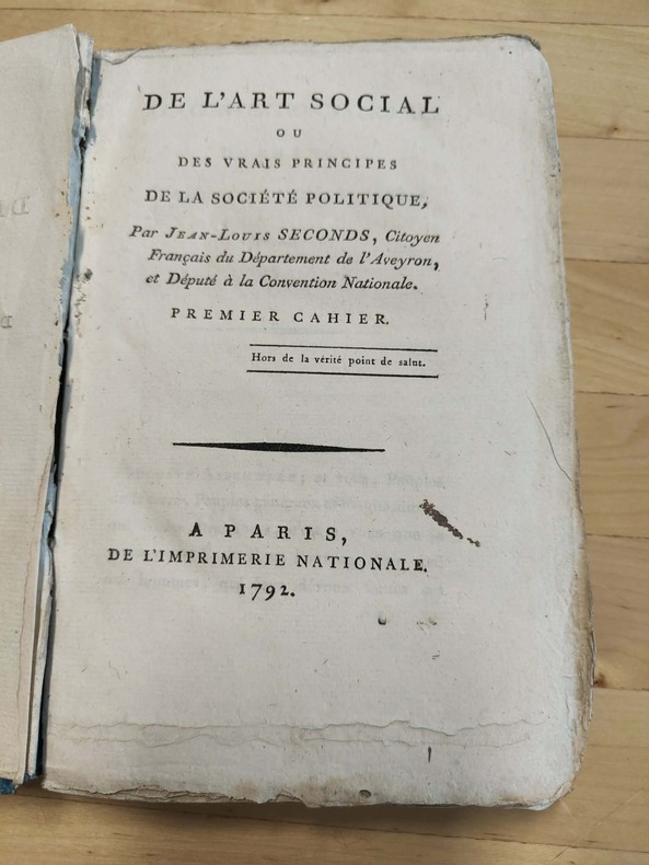 Ouvrage prévu en 4 parties, la troisième a été supprimée et remplacée par l'auteur par les"Opinions politiques et constitutionnelles". Jean-Louis Seconds, homme politique français né dans le Rouergue en 1742, est mort à Paris en 1819. Il était au moment où éclata la révolution, employé supérieur des eaux et forêts. Député à la constituante puis membre de la constituante, puis membre de la convention, il vota pour la mort de Louis XVI et siégea parmi les plus ardents montagnards. De l'art social, petit livre extrêmement remarquable qui montre chez son auteur non seulement un esprit juste et une intelligence très élevée, mais aussi de convictions sincères et raisonnées. Larousse du XIXe vol. 14, p. 452. Dans une conférence, le philosophe Yves Roucaute, Professeur des universités, montre que l’œuvre de Jean-Louis Seconds est fondamentale pour comprendre les tensions de la pensée des révolutionnaires de 1793 et les apories des doctrines révolutionnaires socialistes ultérieures. À partir d’une analyse des Cahiers et des discours de Seconds, où l’appel à la mort du roi se double de l’exigence qu’elle soit prononcée au nom du peuple, Roucaute démontre l’impossibilité de fonder les Droits de l’Homme sur la Raison. Il montre que toute théorie de l’avant-garde mène à un organicisme historique niant le sujet et que ceux qui attribuent la Terreur à la seule volonté de pouvoir, comme Gauchet ou Althusser, méconnaissent le processus révolutionnaire des Jacobins et des socialistes. Toute utopie révolutionnaire, foncièrement réactionnaire, engendre sa propre Terreur : le sacrifice du roi, acte nécessairement raté, préfigure le sacrifice des révolutionnaires eux-mêmes.