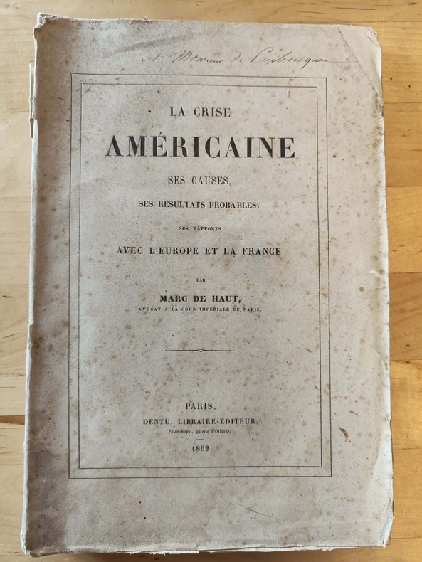 Cet avocat de la cour impériale de Paris analyse dans cet ouvrage la guerre de sécession américaine qui est en cours. Il se préoccupe beaucoup des conséquence économiques pour la France et l'Angleterre.