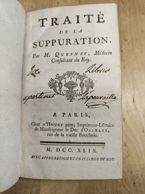 Paris, D'Houry, 1749, in-12, [12]-432 pp, Basane marbrée de l'époque, dos à nerfs et fleuronné, pièce de titre tabac, tranches rouges, Première édition. Ouvrage en trois parties qui s'intéresse à la suppuration purulente, à la cure de suppuration causée par inflammation et à celle qui accompagne la régénération des chairs. Table alphabétique in fine. François Quesnay (1694-1774), en dépit de ses origines très modestes, accomplit "une carrière de médecin-chirurgien éblouissante" (En français dans le texte) : il obtint tous les grades, devint membre de plusieurs académies savantes et fut nommé médecin personnel de la Pompadour. Parmi ses écrits médicaux, celui qu'il consacra à la saignée fut l'un des plus reconnus. Il est surtout passé à la postérité pour ses études physiologiques, qui forment la base de sa pensée philosophique et économique. Installé à la cour en 1749, il put s'occuper d'économie politique comme d'un "passe-temps". Il fut le fondateur de la toute première école systématique d'économie et l'auteur de textes "manifestes", le Tableau économique (1758) et la Physiocratie (1767). Ex-libris de Jean Rouché. Reliure usée, bon état intérieur. Blake p. 368. Hirsch IV, p. 99. Couverture rigide