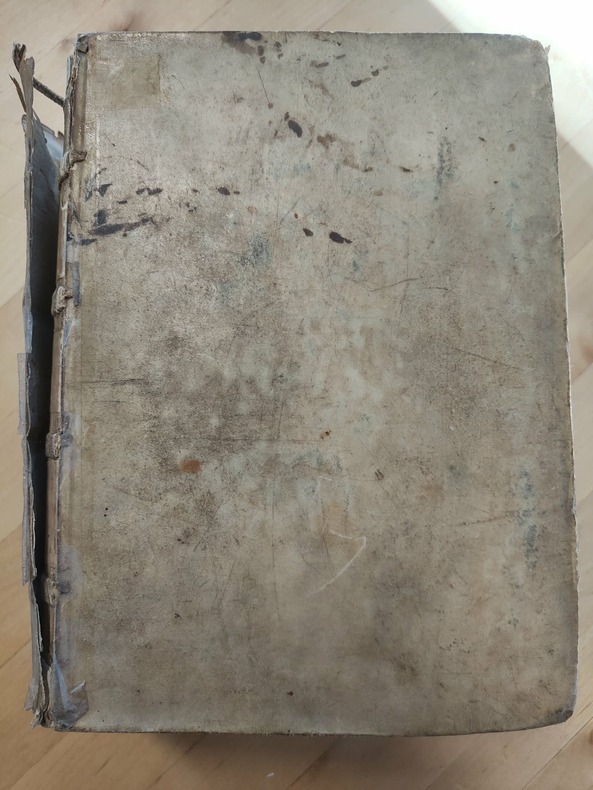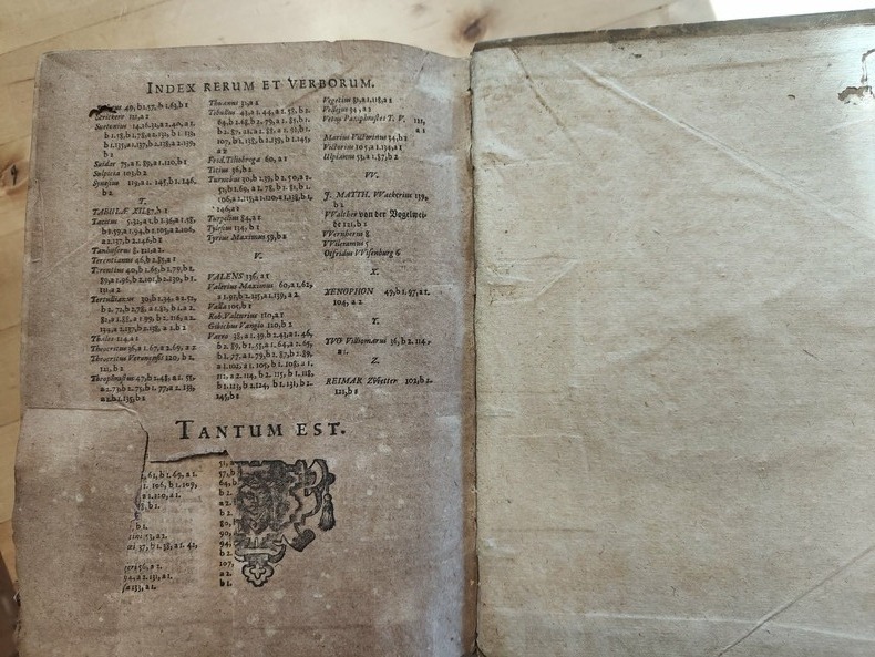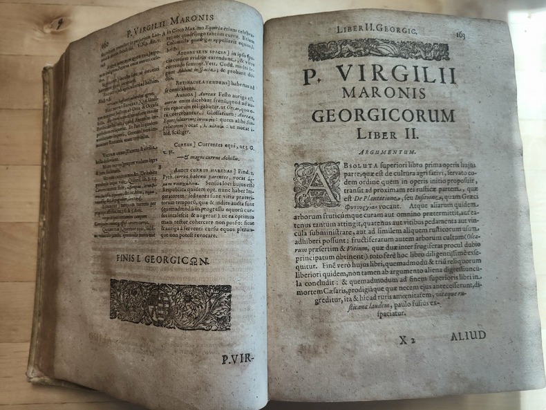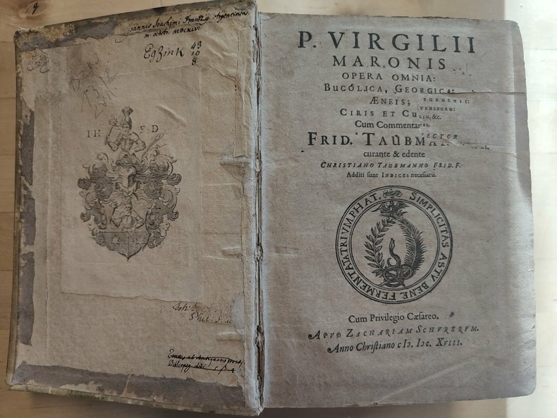 Zacharian Schurerum s.l. (Wittenberg) 1618, fort in-4, (12ff)-1064 pages(39 ff. d'index)-Ciris: (1ff. blanc)72 pages(12 ff. d'index) Culex:147 pages(1pp.)(15 ff. d'index). Vignettes, lettrines et cul de lampe gravés sur bois. Vélin époque, dos en train de se détacher, coiffe supérieure déchirée). Le papier est fortement oxydé et fragile, une déchirure avec petit manque de papier n'altérant pas la lecture dans la marge extérieure pp. 193/194. La page de titre et le dernier feuillet ont été découpés avec petite perte de texte pour faire disparaître un nom?; Ex libris gravé et collé sur le contreplat, noms manuscrits sur ce même contreplat.(LVII)-(2200 gr.)