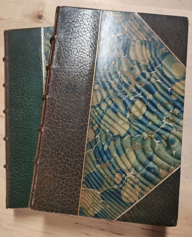 Paris L. Conquet 1883, 2 volumes in-8 (23,5 X 13,5 cm), (2)XXIX-386+432 pages-(4 feuillets de catalogue).32 gravures à l'Eau-Forte in-texte de V. Foulquier. Tirage unique à 500 exemplaire numéroté,n° 434 sur vélin à la cuve, seul papier après les 150 sur Japon extra. Demi maroquin vert foncé à coins (Stroobants), dos ornés, têtes dorées, pleines marges pour les autres tranches,couvertures conservées. Les reliures sont insolées et il y a de petits frottements aux coins.Joli petit ex-libris gravé.(LXX).