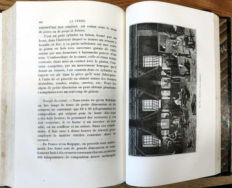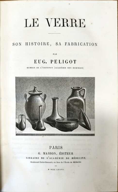 G. Masson, éditeur, 1877. Ouvrage illustré de 75 figures en n&b dans le texte. Au sommaire : Généralités - Poteries et fours de verrerie – Silicates – Verres à vitre – Glaces – Bouteilles – Verrerie de luxe et verrerie commune, cristal – verre de Bohème – Verre de montres – Verres pour l'optique.