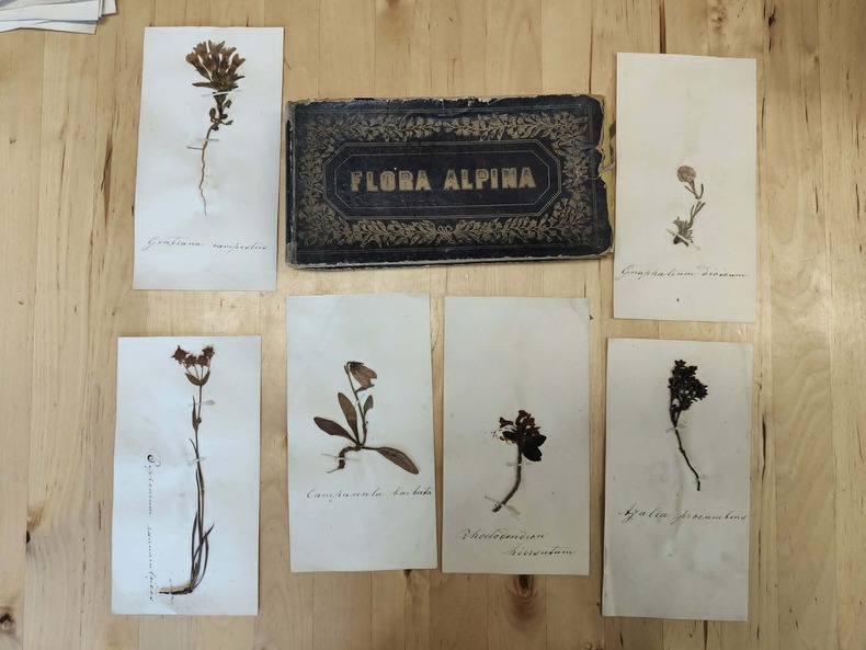 ELLE FLEURIT À CÔTÉ DE LA NEIGE FONDANTE. Charmant herbier comprenant 25 spécimens de fleurs alpines (gentiane, gnaphale, astrance, anémone, soldanelle, crocus...) tous étiquetés. Pour certains spécimens, le système racinaire a été préservé. Il s'agit vraisemblablement d'un travail professionnel proposé aux amateurs de passage. Le présent exemplaire porte quelques annotations manuscrites, précisions techniques reprises du Taschenflora des Alpen-Wanderers des Schröter (Zürich, 1890), de la Flore analytique de la Suisse de Gremli et peut-être d'autres. Ainsi, au sujet de la soldanelle des Alpes, l'amateur écrit : « La floraison se fait, lors même que la température ne dépasse pas 1°. 1500 à 2400 m (rarement à 600 m). Cette espèce annonce le printemps des Alpes. Elle fleurit à côté de la neige fondante ; souvent elle perce même la couche de neige et vient au dessus élever triomphalement ses corolles violettes ». On connait un autre exemplaire actuellement en vente au États-Unis en cartonnage de percaline rouge, pareillement intitulé et sans plus d'informations que celui-ci. Les deux exemplaires ne présentent pas totalement les mèmes espèces. Apparemment aucun exemplaire en France ou ailleurs.
