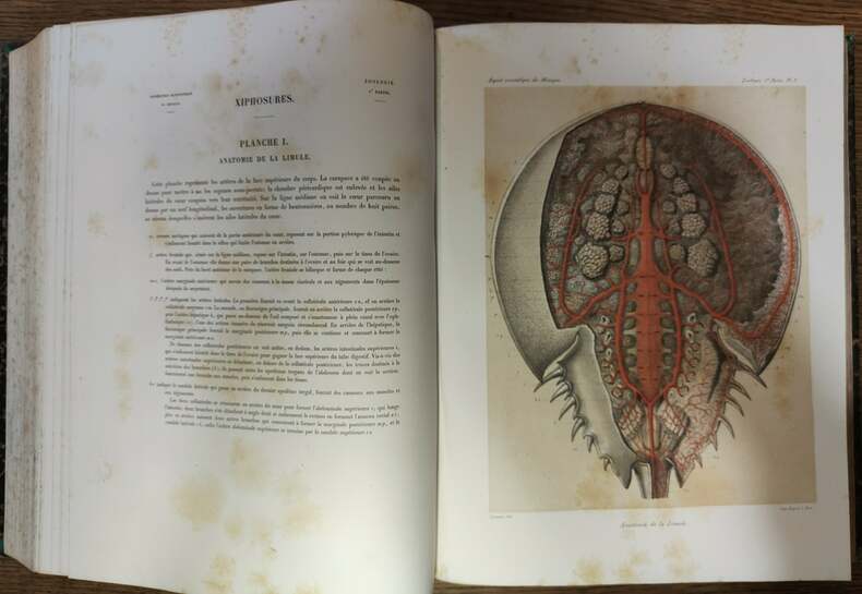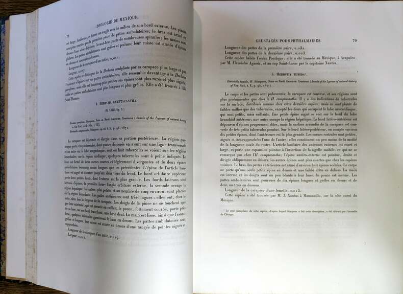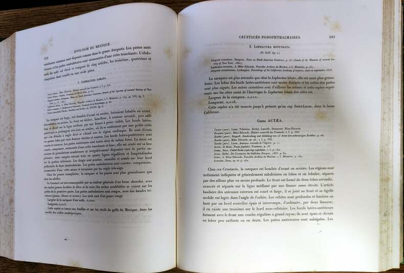 En 1864, deux ans après le début d'une campagne militaire au Mexique, Napoléon III ordonna une expédition scientifique sur le modèle de la célèbre expédition scientifique initiée par Napoléon Ier en Égypte, à la suite de la campagne militaire dans ce pays. Alphonse Milne Edwards était le fils d'Henri Milne-Edwards,médecin et zoologue de renom il fut professeur de zoologie à l'École de pharmacie et au Muséum qu'il dirigea de 1892 à sa mort. Ses travaux, consacrés notamment aux oiseaux fossiles et à la vie des faunes abyssales, lui valurent d'entrer à l'Académie des sciences en 1879. Le tome premier semble être le texte seul, les planches ayant fait l'objet d'une publication séparée sont de fait le tome second. Colation de WoRMS:Tome premier. [8 unpaginated] + 1–368 + [63 unpaginated plate legends], pls. 1–61 + 5A + 31A [= 63 plates]. {Dates of publication—Livraison 1: [6 unpaginated] + pp. 1–24, pls. 1–7: 20 September 1873; Livraison 2: pp. 25–56, pls. 8–14: 28 October 1873; Livraison 3: pp. 57–120, pls. 15–20: 4 December 1875; Livraison 4: pp. 121–184, pls. 21–27, 29, 30: 1878; Livraison 5: pp. 185–224, pls. 31–39: 1879; Livraison 6: pp. 225–264, pls. 40–43, 45–48, 5A: 1879; Livraison 7: pp. 265–312, pls. 31A, 44, 49–54: 1880; Livraison 8: pp. 313–368 + [8 unpaginated pp.], pls. 55–61: 1880}. La planche 5A est dans notre exemplaire 15A.