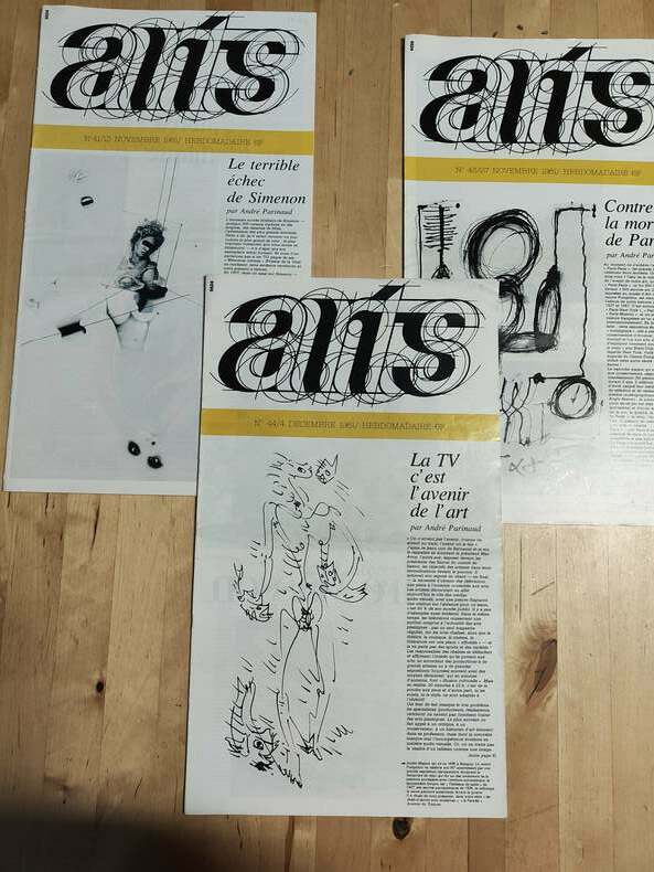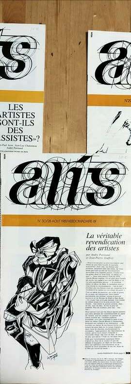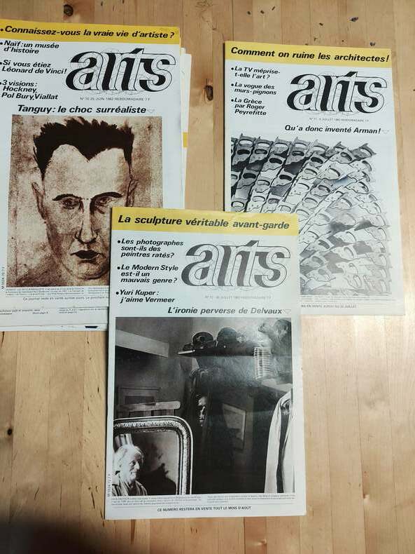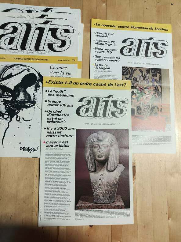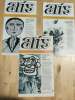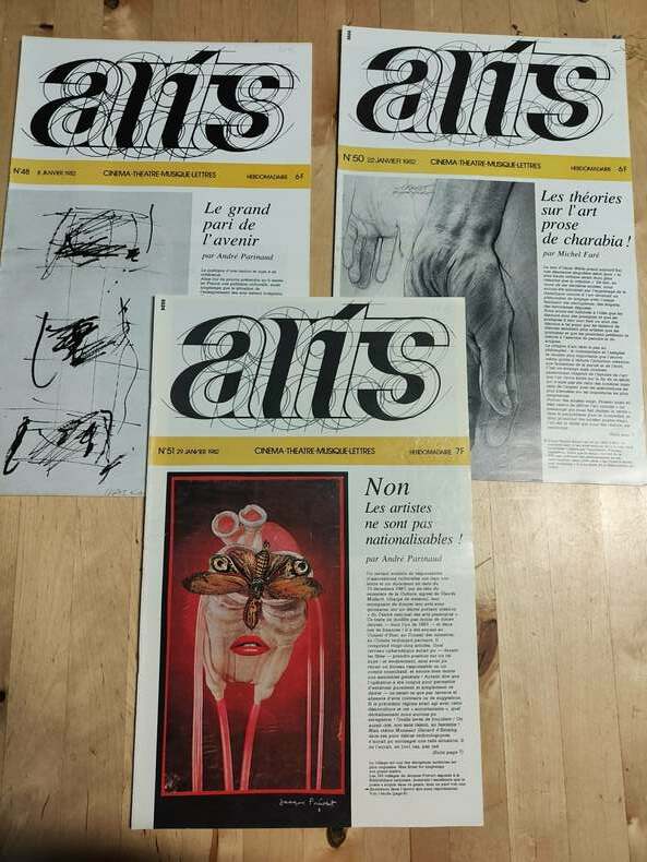 Paris Arts 1981-1982. Nous proposons à la vente cet ensemble de 35 numéros: Du n° 25 du 3 juillet 1981 jusqu'au n° 36 du 8 octobre 1981. (Le n° 37 manque) du n° 38 et 39 (le n° 40 manque) du n° 41 à 44. changement de format passant de 26X44cm à 26X40cm vertical, et le sous titre "Cinéma-Théâtre-Musique-Lettres" apparait jusqu'au n° 62 puis disparait. Du n°48-50-51-54-57-à 63-et de 66 à 72. 22 pages agrafées, couvertures illustrées, illustrations en noir et blanc puis parfois en couleurs. Bon état général.(CXX)