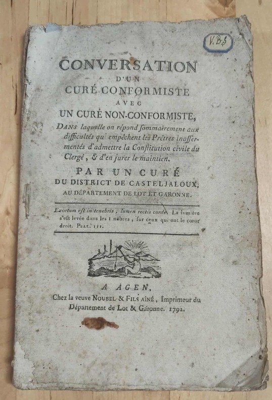 Le curé conformiste étant le prêtre constitutionnel et le curé non-conformiste étant le prêtre réfractaire; la conversation concerne leurs divergences sur leur sacerdoce.