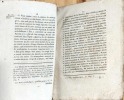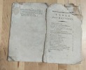 Agen chez la veuve Noubel 1792, plaquette in-8 de 72 pages. 5 cahiers cousus sans couverture; corné avec des manques de papier marginaux aux deux derniers feuillets, ainsi que des tâches et un angle détaché à restaurer. Page de titresouillée. -(CXXI)-((à gr.).