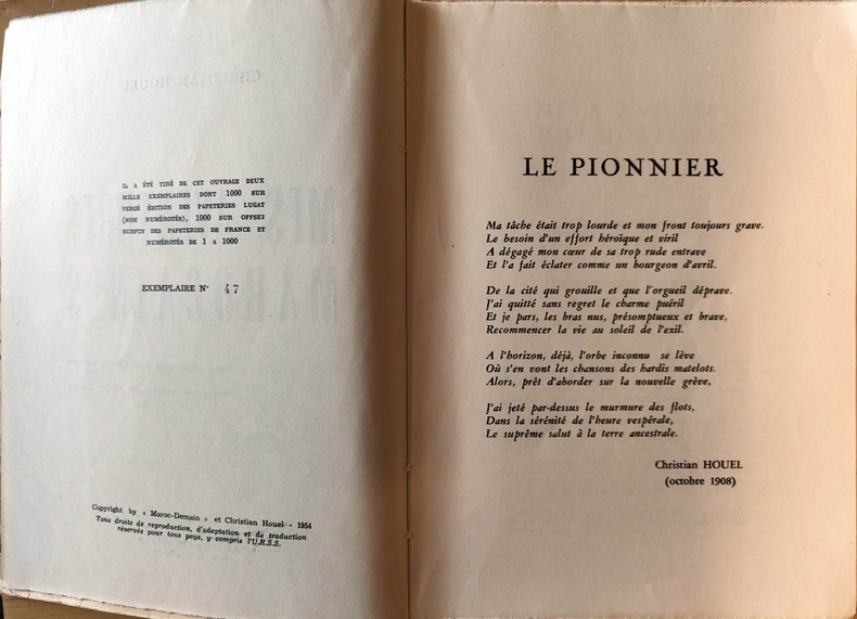 Casablanca éditions "Maroc-Demain" 1954, in-8 carré, 277 pages; 1ère édition numérotée 47/2000.Broché, bon état. (CXXIII)-(500 gr.)
