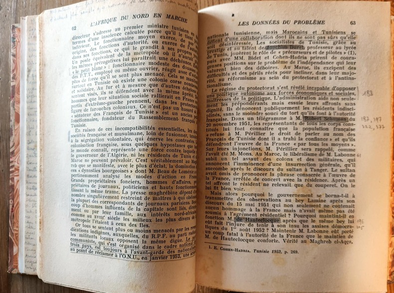 Algérie, Tunisie, Maroc, 1880-1952. Voici un livre d'histoire qui ne ressemble à aucun autre. Ecrit à chaud en 1952, alors qu'en Tunisie et au Maroc l'épreuve de force menaçait et que régnait en Algérie selon les spécialistes officiels « une extraordinaire quiétude », il fait le point sur l'aboutissement d'un siècle de système colonial et décrit la succession d'occasions manquées qui entraînera une décolonisation violente et traumatique. Livre d'histoire immédiate, considéré en France et à l'étranger comme un ouvrage de référence, il conserve un demi-siècle après sa parution (en 1952) une présence saisissante par sa lucidité, l'honnêteté de ses choix et la vivacité de son style. Il demeure aujourd'hui encore une synthèse inégalée de l'histoire du Maghreb, indispensable à quiconque veut comprendre en profondeur les réalités maghrébines. — "« Nulle part au Maghreb ne joua la fatalité mais l'aveuglement colonial. » Ce que prouve amplement ce livre, écrit en 1952, et dont la deuxième édition était épuisée en moins d'un an malgré les obstacles mis à sa diffusion. Sa réédition, aujourd'hui, permet de juger de l'étonnante lucidité de son auteur, et de la justesse de points de vue soutenus il y a vingt ans. Si l'introduction est longue et confuse, le premier chapitre indique parfaitement « les données du problème » de l'Afrique du Nord coloniale : le portrait des colons européens laisse présager de l'issue du conflit à venir. Et l'on débouche sur le meilleur de ce livre, passionné autant que passionnant : l'étude de la genèse des nationalismes tunisien, marocain et algérien. La fin de l'ouvrage, quelque peu alourdie par un excès de faits, n'en présente pas moins avec sûreté la crise des trois pays maghrébins au début des années 50. Ainsi que l'impasse à laquelle aboutit « la politique des occasions perdues » menée avec constance par la France pendant près d'un demi-siècle. Complété par de précieuses orientations bibliographiques, ce livre magistral fait honneur à son auteur. Il éclairera le lecteur sur les réalités de l'Afrique du Nord avant les indépendances du Maroc et de la Tunisie, et à la veille de la guerre d'Algérie." (S. Urfer, revue Etudes, 1972)