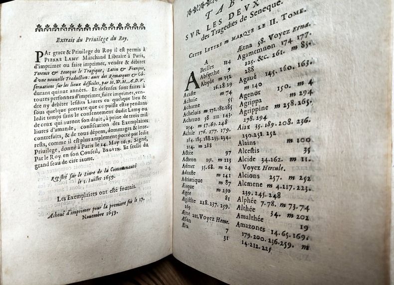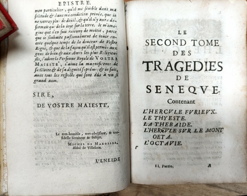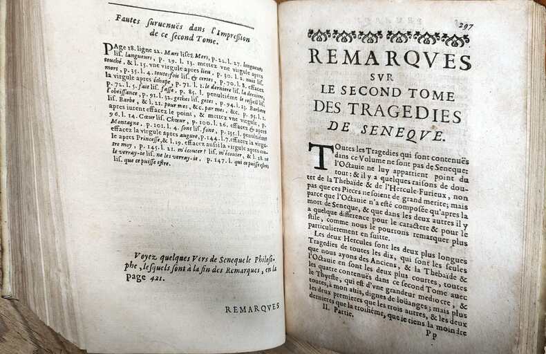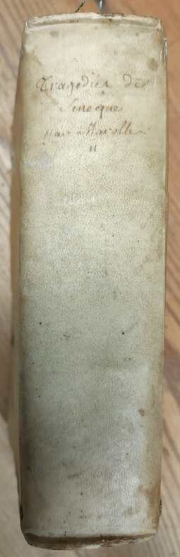 Paris Pierre Lamy 1664, in-12, (il manque les deux feuillets de titre, le ff.d'avertissement, la page d'épigramme et les 5 pages de sonnet)-207 feuillets- à partir du ff. chiffré 297 la pagination continue par pages (de la page 297 à 433, celà correspond aux "Remarques sur le second tome des tragédies de Sénèque)-(1 pp)-10 ff. n.ch. de tables).Vélin époque, dos titré à la main; petit travail de rongeur sur le coin supérieur du second plat et sur la coupe inférieure du même plat. Les feuillets ne sont pas atteints.(CXXII)-(600 gr.)