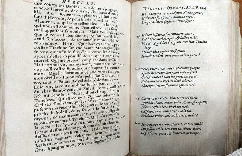 Edition justalinéaire, le texte français est sur verso la page de gauche et le texte latin sur le recto de la page suivante et porte le même n° de page. Curieusement passé le frontispice-la page de titre-les pages d'épistre ce n'est plus L'Eneide de Virgile en latins et en françois, avec des remarques utiles & fort amples, mais le second tome des tragédies de Sénèque de l'édition publié chez De Luyne en 1662, Lamy de 1664 qui prennent la suite