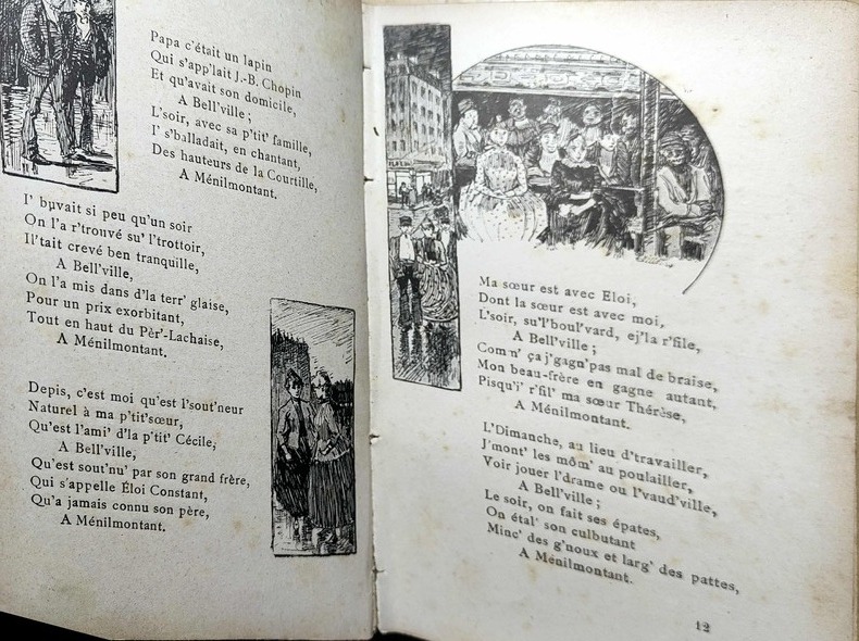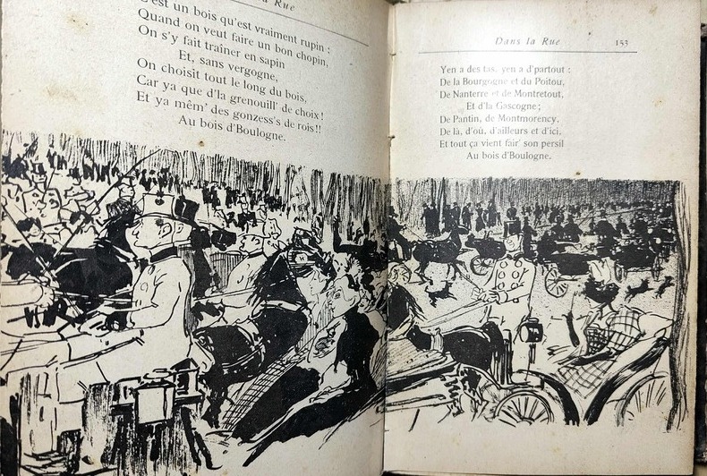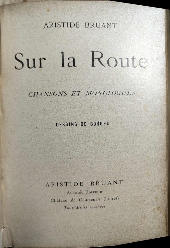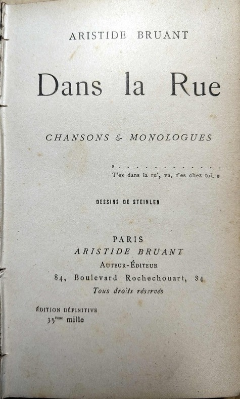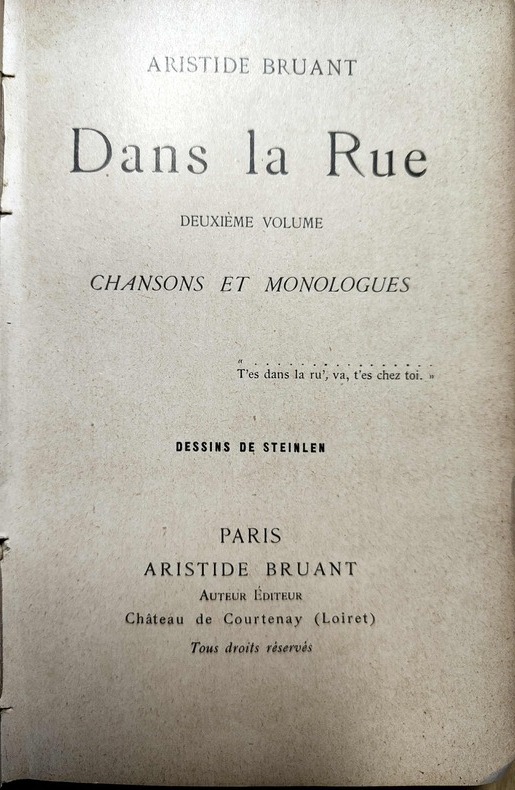 Paris Aristide Bruant sd (c.1897), 3 vol. in-12 reliés en un.volume demi basane rouge. 208+208+208 pages. Dessins in-texte de Steinlen pour "Dans la rue" et de Borgeux pour "Sur la route.Papier jaûni et petits frottements aux coupes; ex; court de marges, quelques ressauts de cahier.Ex-libris illustré. (XVI)-(1000 gr.)