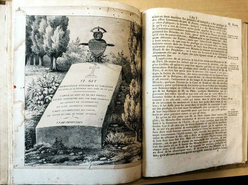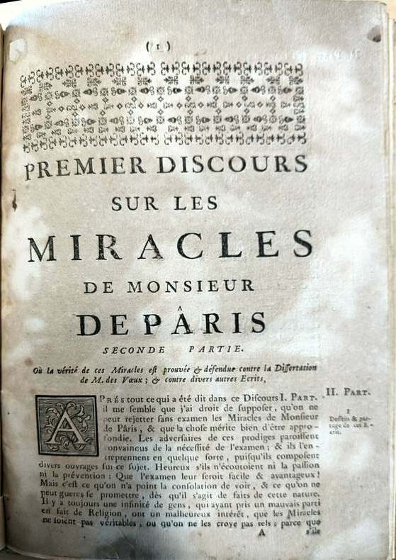 Seconde partie seule.Où la vérité de ces miracles est prouvée & défendue contre la Dissertation de M. de Voeux; & contre divers autres Ecrits. Le nom de convulsionnaire a été donné à des jansénistes illuminés qui se livraient à des manifestations d’hystérie collective. Le diacre François de Pâris, janséniste d’une foi ardente, en fut la cause bien malgré lui. Il meurt en 1727, en léguant tous ses biens aux pauvres. Enterré au cimetière Saint-Médard à Paris, les miracles et actes de dévotion vont se multiplier sur sa tombe - jusqu’à la fermeture du cimetière en 1732 pour cause de scandale public, contraignant les convulsionnaires à la clandestinité. Parmi eux, de nombreux religieux furent enfermés à Vincennes et à Bicêtre. Le mouvement refluera dans la seconde moitié du siècle, suscitant l’ironie des Encyclopédistes.
