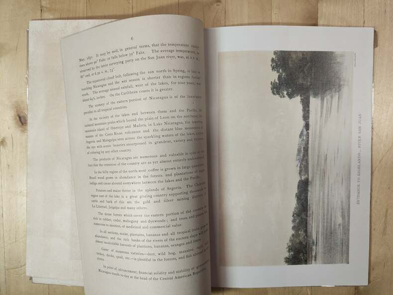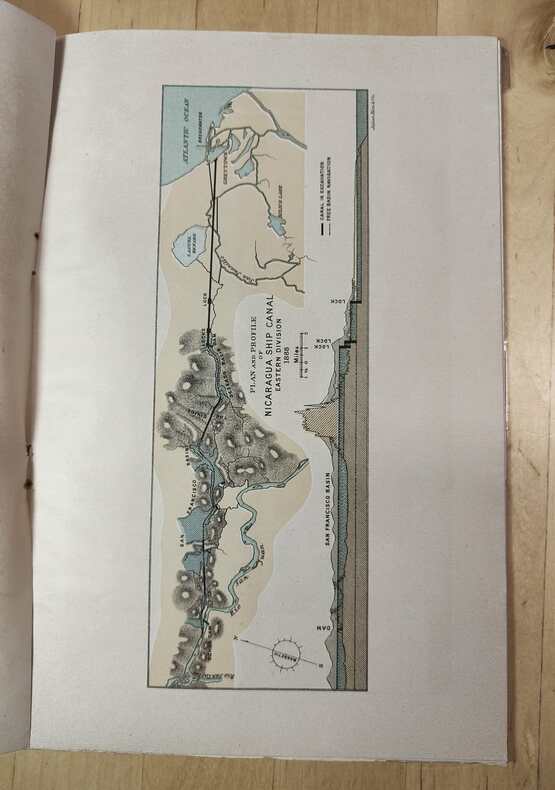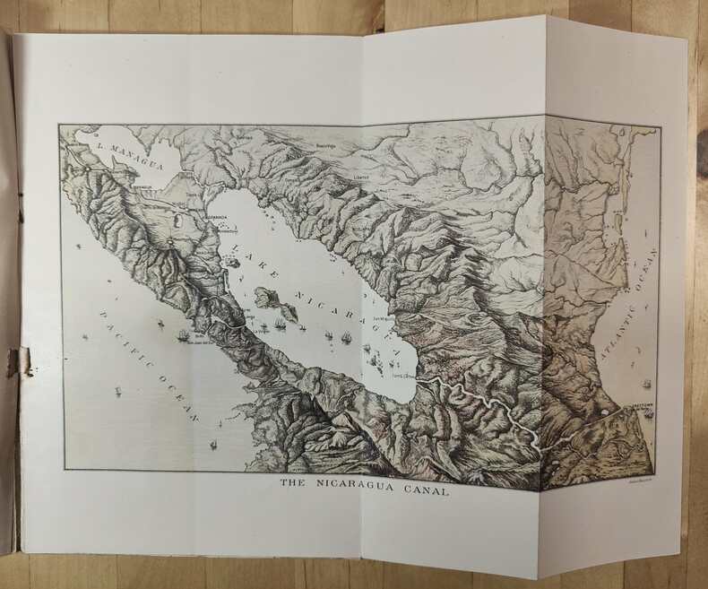 New York Julius Bien pour la Maritime Canal Compagny of Nicaragua. Plaquette in-8, 20 pages de texte en anglais, français et allemand. 2 cartes hors texte en couleurs dont une dépliante, un plan et 3 vues hors texte en couleurs. Broché, couverture imprimée légèrement tâchée, sinon bel exemplaire. (XXVI)-(120 gr.)
