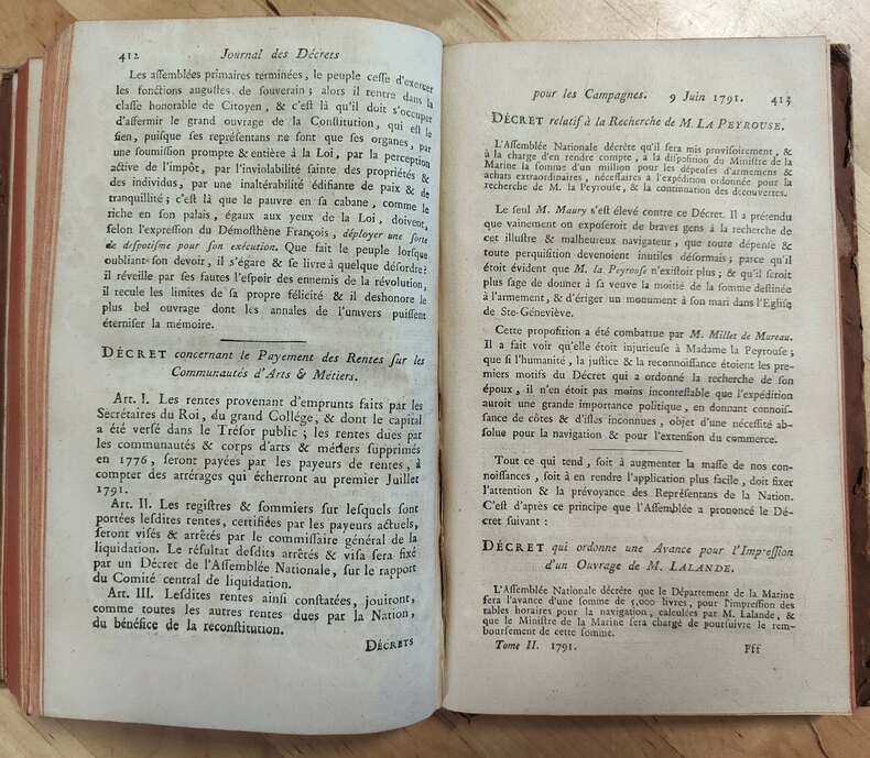 A Paris, chez Baudouin, Imprimeur de l'Assemblée nationale/De l'Imprimerie du Journal des décrets, [1789-1794], 26 volumes in-8 de 125x205 mm environ, de 200 à 600 pages par volume (environ 14 330 pages au total), Septembre 1791 en deux parties, pagination continue pour les volumes Août et Septembre 1793, 29 tableaux dépliants. Demi-basane havane mouchetée et papier à la colle rose, dos à faux-nerfs, titres et tomaisons dorés sur pièces de cuir rouge, tranches mouchetées, gardes blanches. Coiffes émoussées comme habituellement, griffures et décolorations sur les plats, pages de titres tamponnées, de nombreux feuillets répétés, quelques rousseurs, page de titre et d'avertissement déchirées au volume de Février 1791, travail de vers sur le volume Mars-Avril 1792, un volume avec des mouillures, sinon bon état général. Rare ensemble.