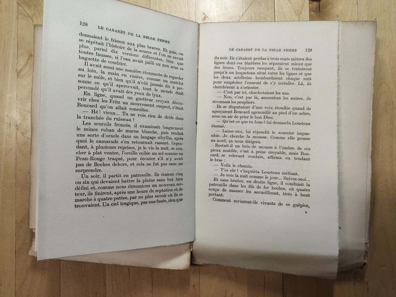 Magnifique exemplaire en parfait état, parfaitement relié, du tirage en grand papier, sur hollande, de l'édition définitive. La très belle reliure de qualité met magnifiquement en évidence les superbes marges conservées. Dans cette version définitive, trois chapitre supprimés des "Croix de Bois" sont insérés en fin d'ouvrage, précédé de l'avertissement suivant : "Ces trois chapitres qui figuraient dans la première version des Croix de Bois ne furent pas maintenus dans la version définitive. Le lecteur comprendra qu'il était difficile à l'auteur, alors simple caporal, de présenter quelques-unes de ces pages au visa de la censure militaire". "Le Cabaret de la Belle Femme" constitue d'ailleurs une suite au célèbre récit des "Croix de Bois".