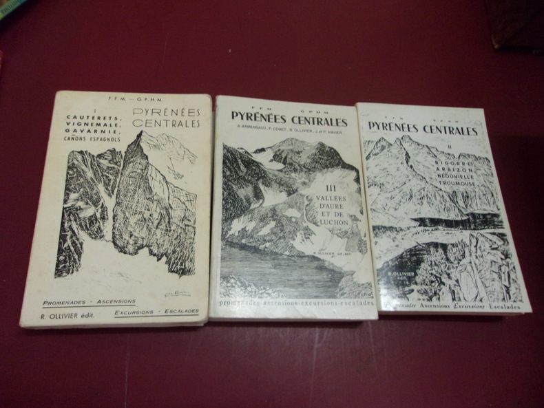 3 volumes. Editions Ollivier, 1976/1988. Format : 16/12. Tome I : Cauterets, Vignemale, Gavarnie, Canons espagnols : 403 itinéraires - 15 cartes - 60 croquis. Pages : 39 (mise à jour) + XIV + 352. Tome II : Bigorre, Arbizon, Néouvielle, Troumouse : 416 itinéraires - 21 cartes - 47 croquis - Pages : 14 (mise à jour) + XIX + 324.. Tome III : Vallées d'Aure et de Luchon : 470 itinéraires - 10 cartes - 70 croquis. Pages : XIII + 371. Couvertures défraîchies intérieurs bon état.