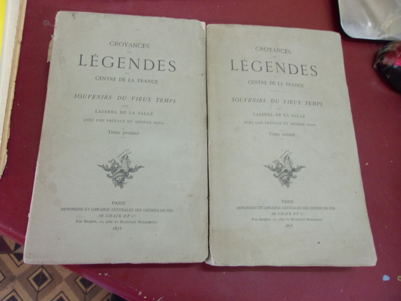 1875 Paris, Chaix, 1875. 2 volumes in-8, XXVpp.-338pp. - 2ff.-404pp. Brochés. Édition originale, la seule à contenir la préface de George Sand, supprimée dans l'édition de 1900. Belle étude sur les croyances populaires en Berry : fêtes populaires ; fééries ; diableries ; animaux fantastiques ; sorcellerie ; médecine ; moeurs ; langage ; dictons et proverbes ; légendes historiques. (Vicaire IV, col. 941).