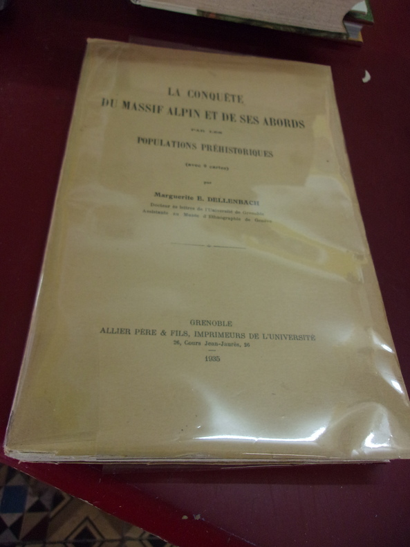 Première édition. Intéressante étude sur les premiers hommes dans les Alpes, avec une importante bibliographie. L'auteur Mme Marguerite E. Dallenbach, docteur ès lettres de l'Université de Grenoble et assistente au Musée d'Ethnographie de Genève à dedicacé l'ouvrage ‘à Monsieur Maurice Penel Hommage de l'auteur’ signé Marg. Lobsiger-Dellenbach. Perret 1265.