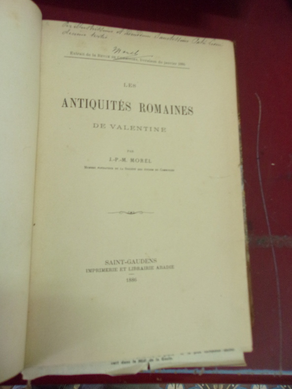 Librairie Abadie, 1886/1887. Format : 25/17. Ensemble rarissime de 3 plaquettes : Les antiquités romaines de Valentine (1886) : 14 pages: Les antiquités romaines de Valentine (1886) Les thermes des Onésiens (Extrait du Bulletin de la Société Nationale des Antiquaires Scéance du 11 juillet 1877) : 4 pages. La Franc-Maçonnerie et le théâtre français à Saint Gaudens de 1748 à 1754. (1887) : 7 pages. Editions originales. Sur chaque plaquette écrit à l'encre un texte en latin avec la signature de l'auteur. Reliure demi basane à coins aux plats marbré - Ensemble bon état