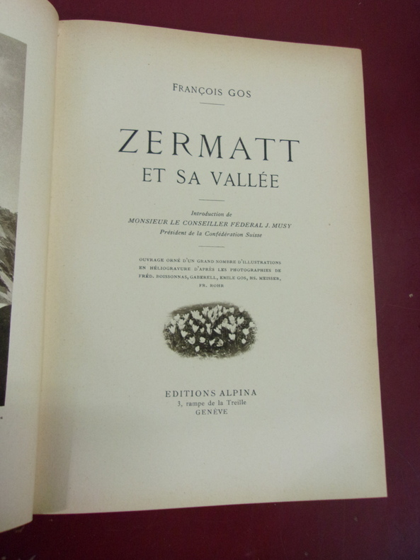 1925 1925 introduction de M. le conseiller fédéral J. Mussy, président de la confédération suisse. ouvrage orné d'un grand nombre d'illustrations en héliogravure d'après les photographies de Fred. Boissonnas, Gaberell, Emile Gos, Hs. Meisser, Fr. Rohr. Edité à la librairie Pellissier à Thonon. 1925. 180 pages. une carte dépliante en couleurs des environs de Zermatt in fine. 161 illustrations.couvertures conservées en couleurs ( le Cervin depuis Zermatt ). un volume in 8. 1/2 maroquin à coins aubergine. dos à nerfs. titre doré. dos légèrement passé. tête dorée. ébarbé. Bel exemplaire.