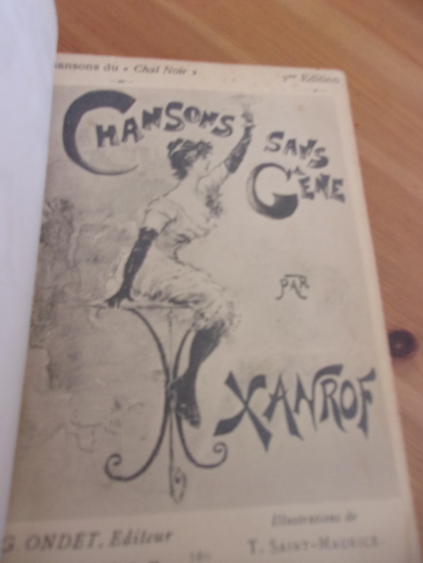 G. Ondet, 1890. Format : 33/25. Pages : 192. Illustré par T. Saint-Maurice. Recueil de chansons du Chat Noir pour la plupart avec musique de Xanrof et illustrées de dessins Bombled, M.Capy, J.Grün, Sonnier, M.de Thoren. Complet de ses 2 reproductions d'affiches dépliante en fin de volume. Reliure demi chagrin, coins émoussés intérieur bon état.